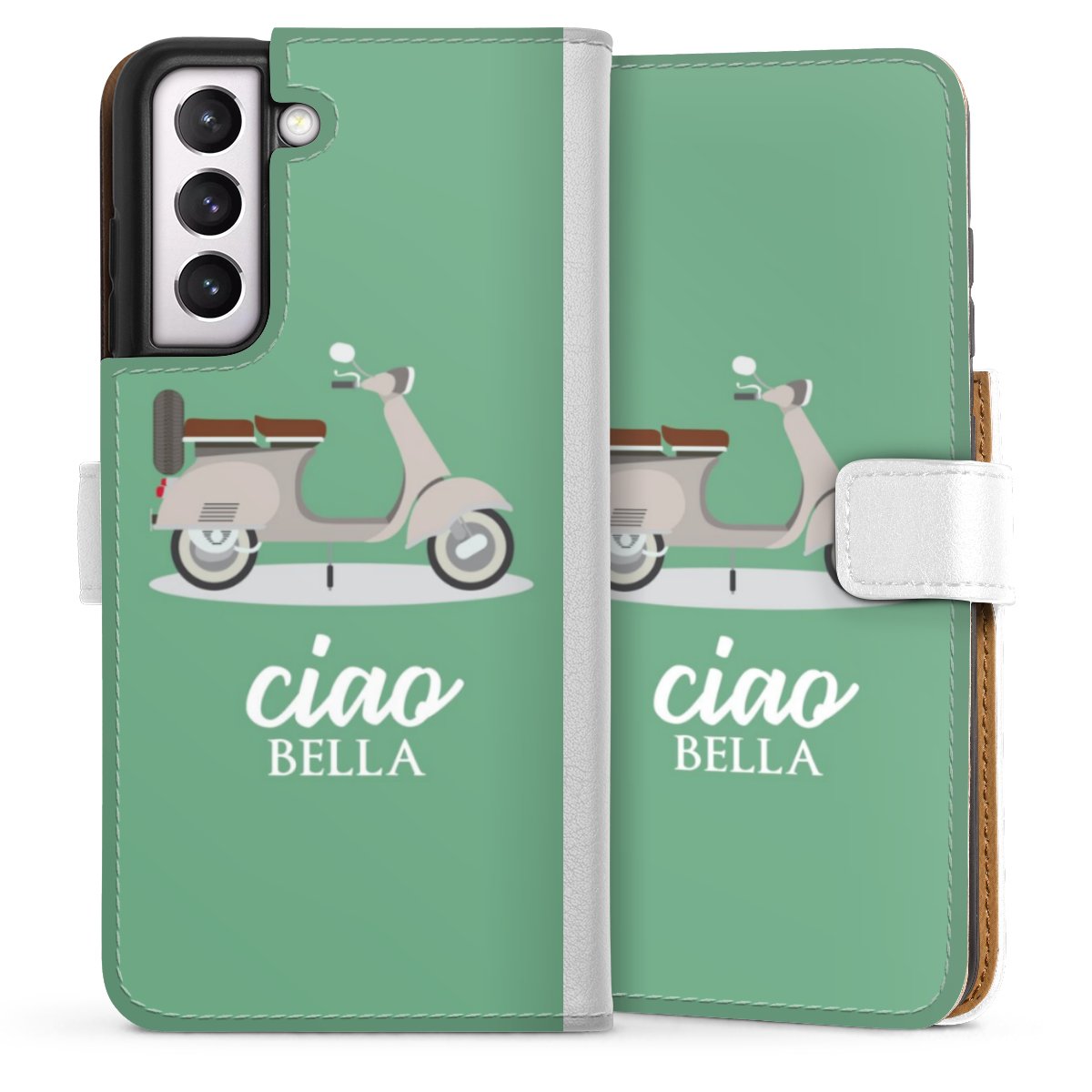 For our Sideflip Case we are using our advanced direct printing technology. The back and frontside are fully printabale, the inside of the phone bag is left unprinted. You can order the phone case without print, printed completely or also with a partial print.
