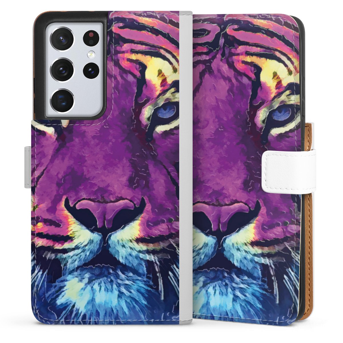 For our Sideflip Case we are using our advanced direct printing technology. The back and frontside are fully printabale, the inside of the phone bag is left unprinted. You can order the phone case without print, printed completely or also with a partial print.