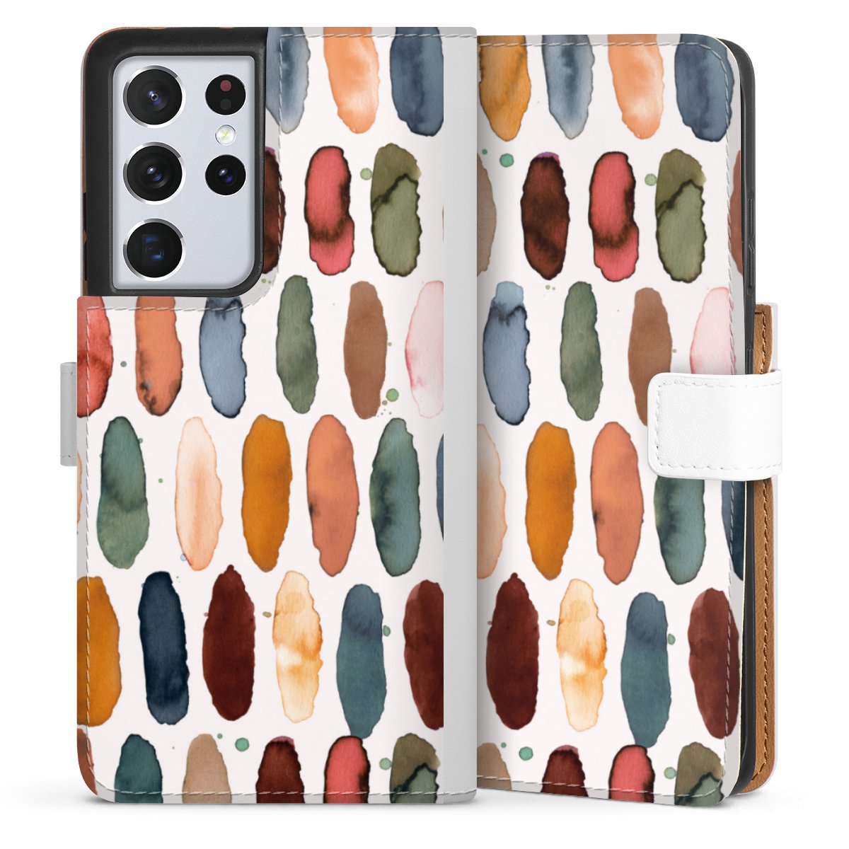 For our Sideflip Case we are using our advanced direct printing technology. The back and frontside are fully printabale, the inside of the phone bag is left unprinted. You can order the phone case without print, printed completely or also with a partial print.