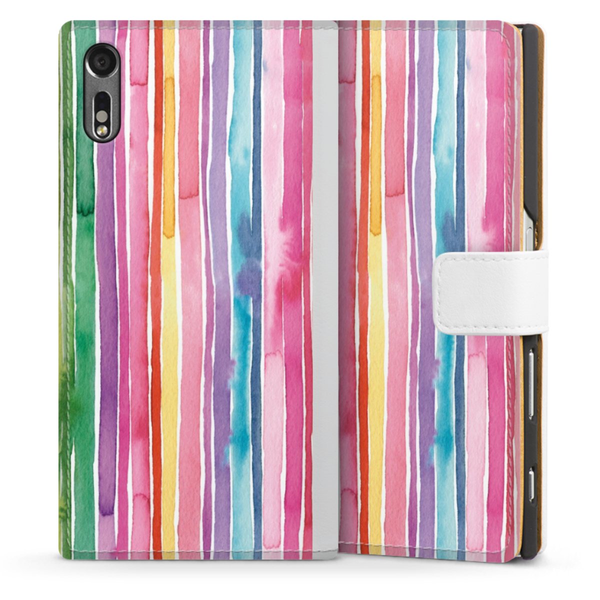 For our Sideflip Case we are using our advanced direct printing technology. The back and frontside are fully printabale, the inside of the phone bag is left unprinted. You can order the phone case without print, printed completely or also with a partial print.