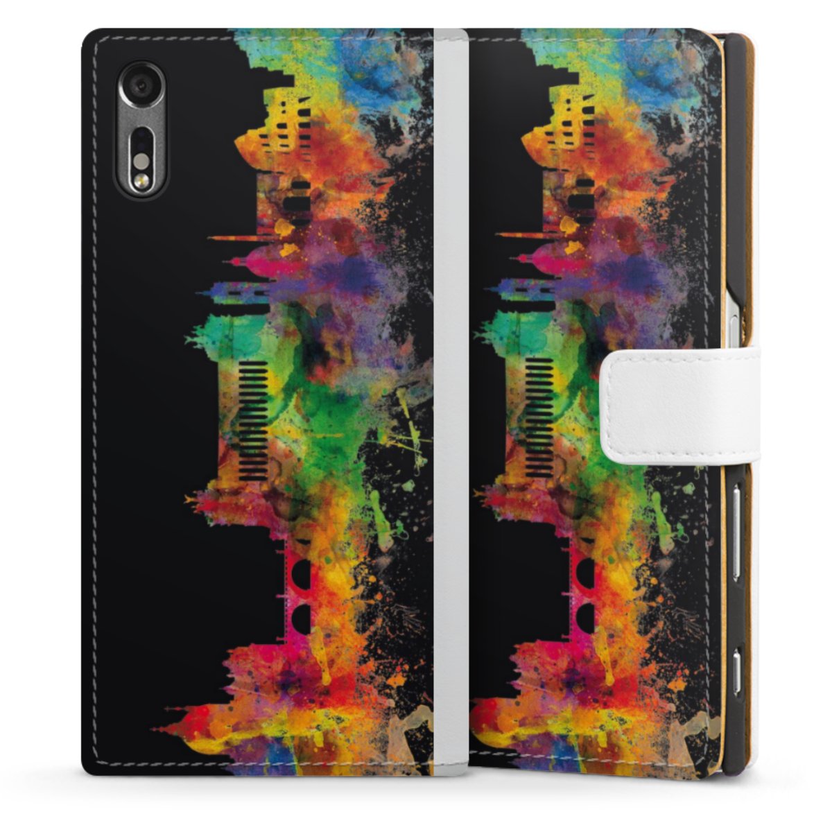 For our Sideflip Case we are using our advanced direct printing technology. The back and frontside are fully printabale, the inside of the phone bag is left unprinted. You can order the phone case without print, printed completely or also with a partial print.