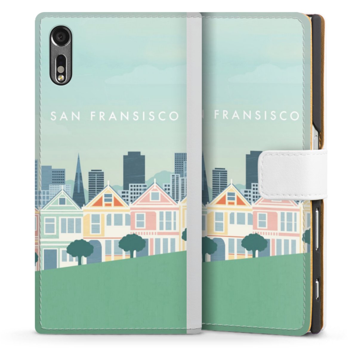 For our Sideflip Case we are using our advanced direct printing technology. The back and frontside are fully printabale, the inside of the phone bag is left unprinted. You can order the phone case without print, printed completely or also with a partial print.