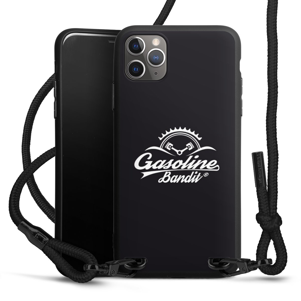 The matt black silicone case is made of flexible TPU (thermoplastic polyurethane) and offers robust protection. The durable, unbreakable material makes the cover flexible and dimensionally stable at the same time. The matte surface makes your design stand out more and is less susceptible to fingerprints and dirt. The stylish trend accessory fits comfortably in the hand and is perfectly complemented by the fabric (polyester) mobile phone strap. The braided fabric strap is approx. 1.70 metres long with a diameter of approx. 0.5 cm. Due to the special knotting technique, the length of the strap can be adjusted by simply pulling it, so that you can adapt it individually to your wishes. The practical case to wear around your neck is available with the fabric strap in black. As a little icing on the cake, we have provided the strap with a chic metal fastener in matt black. The strap is securely fastened to the case with loops made of high-quality genuine leather and press studs. The ends of the fabric strap are covered with metallic end caps and thus protected from fraying.