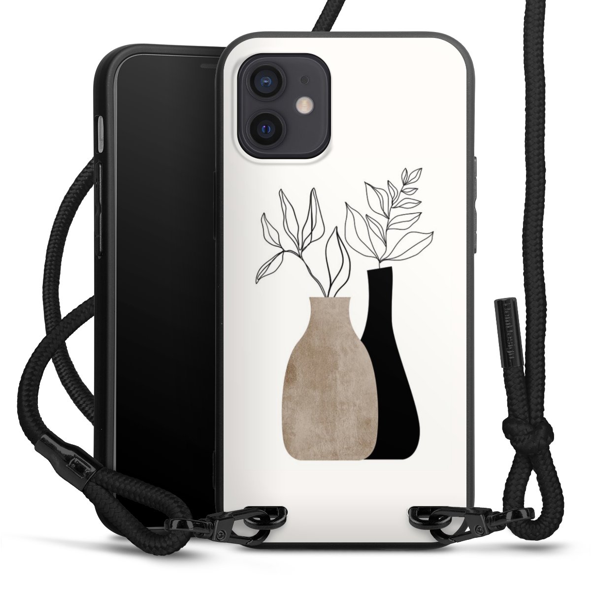 The matt black silicone case is made of flexible TPU (thermoplastic polyurethane) and offers robust protection. The durable, unbreakable material makes the cover flexible and dimensionally stable at the same time. The matte surface makes your design stand out more and is less susceptible to fingerprints and dirt. The stylish trend accessory fits comfortably in the hand and is perfectly complemented by the fabric (polyester) mobile phone strap. The braided fabric strap is approx. 1.70 metres long with a diameter of approx. 0.5 cm. Due to the special knotting technique, the length of the strap can be adjusted by simply pulling it, so that you can adapt it individually to your wishes. The practical case to wear around your neck is available with the fabric strap in black. As a little icing on the cake, we have provided the strap with a chic metal fastener in matt black. The strap is securely fastened to the case with loops made of high-quality genuine leather and press studs. The ends of the fabric strap are covered with metallic end caps and thus protected from fraying.