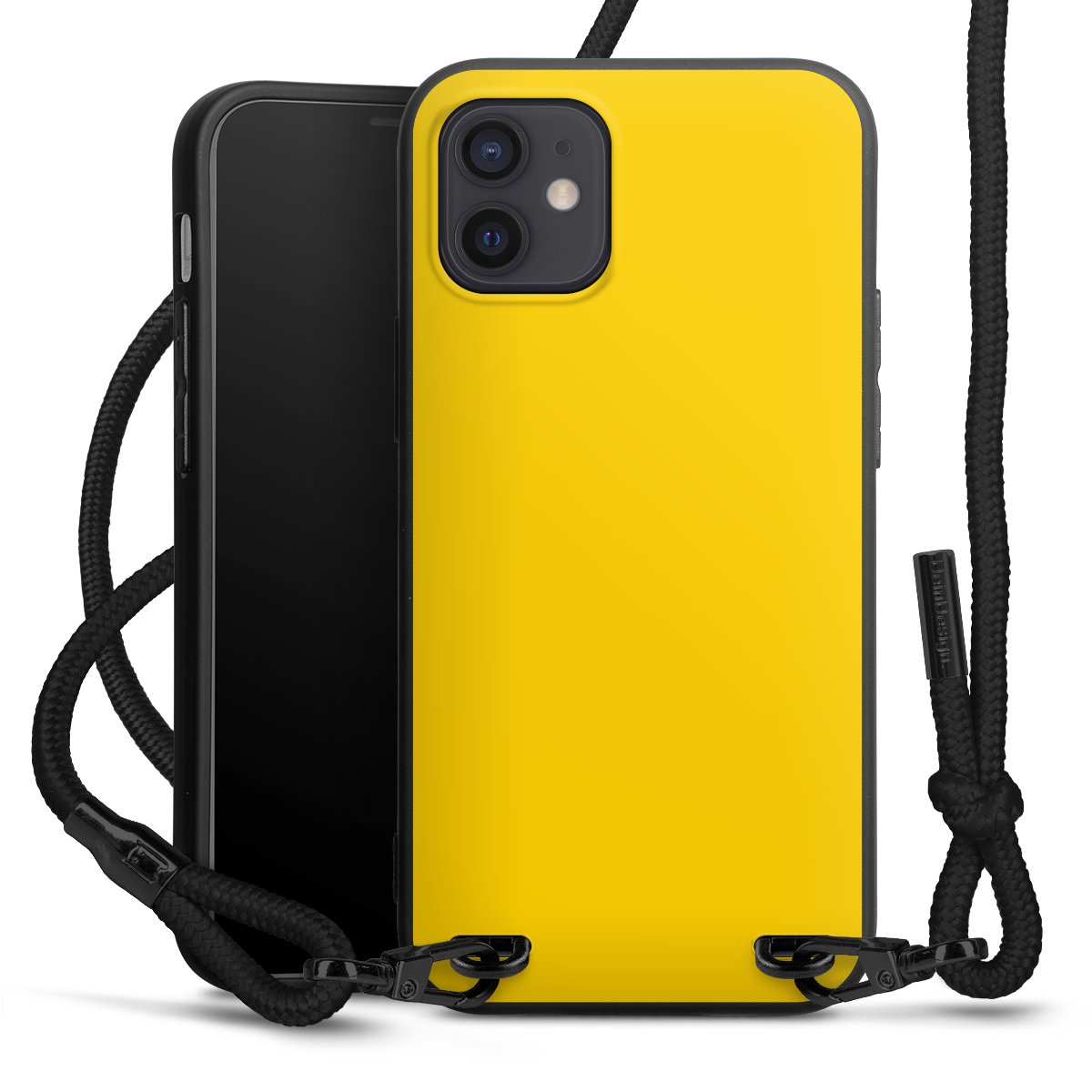 The matt black silicone case is made of flexible TPU (thermoplastic polyurethane) and offers robust protection. The durable, unbreakable material makes the cover flexible and dimensionally stable at the same time. The matte surface makes your design stand out more and is less susceptible to fingerprints and dirt. The stylish trend accessory fits comfortably in the hand and is perfectly complemented by the fabric (polyester) mobile phone strap. The braided fabric strap is approx. 1.70 metres long with a diameter of approx. 0.5 cm. Due to the special knotting technique, the length of the strap can be adjusted by simply pulling it, so that you can adapt it individually to your wishes. The practical case to wear around your neck is available with the fabric strap in black. As a little icing on the cake, we have provided the strap with a chic metal fastener in matt black. The strap is securely fastened to the case with loops made of high-quality genuine leather and press studs. The ends of the fabric strap are covered with metallic end caps and thus protected from fraying.