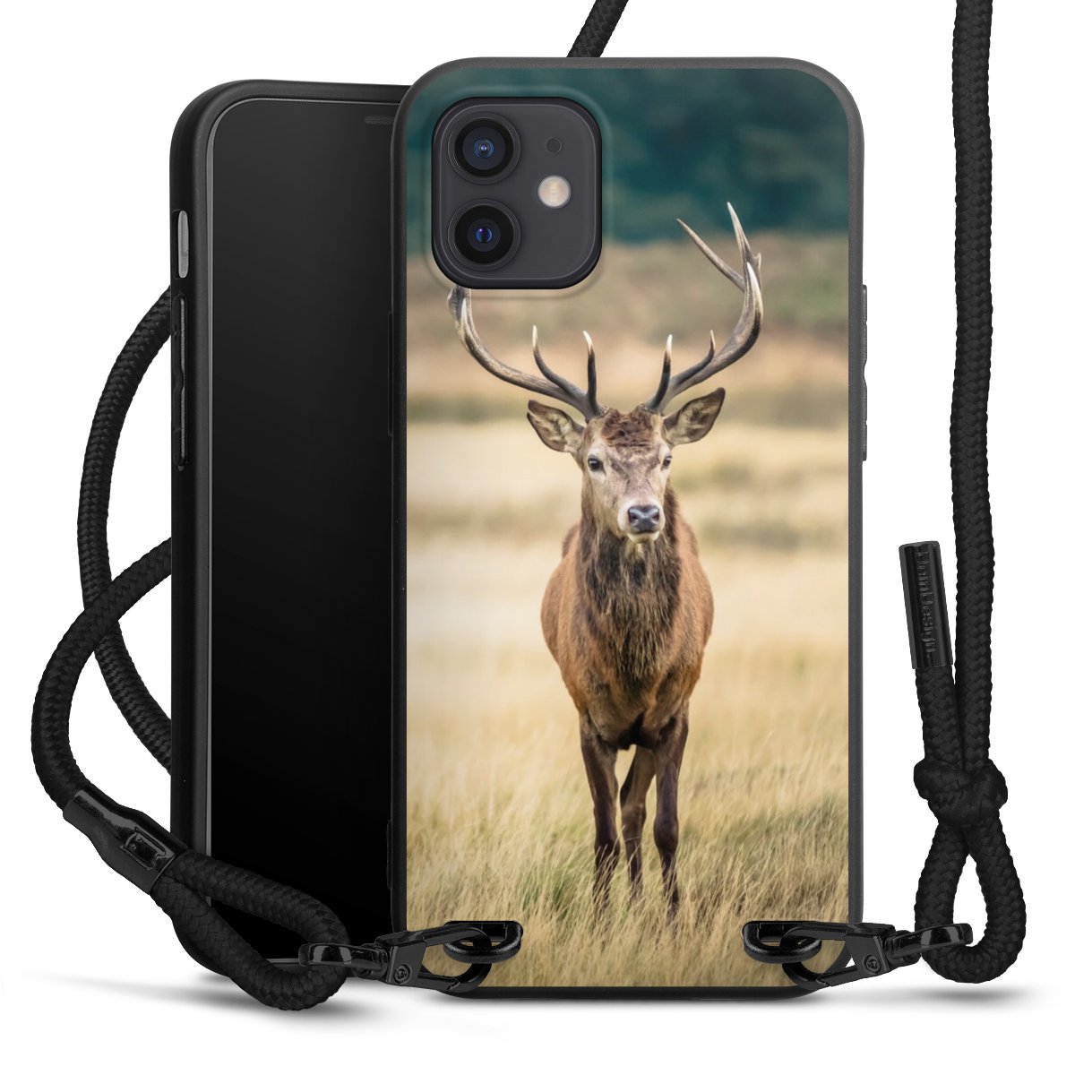 The matt black silicone case is made of flexible TPU (thermoplastic polyurethane) and offers robust protection. The durable, unbreakable material makes the cover flexible and dimensionally stable at the same time. The matte surface makes your design stand out more and is less susceptible to fingerprints and dirt. The stylish trend accessory fits comfortably in the hand and is perfectly complemented by the fabric (polyester) mobile phone strap. The braided fabric strap is approx. 1.70 metres long with a diameter of approx. 0.5 cm. Due to the special knotting technique, the length of the strap can be adjusted by simply pulling it, so that you can adapt it individually to your wishes. The practical case to wear around your neck is available with the fabric strap in black. As a little icing on the cake, we have provided the strap with a chic metal fastener in matt black. The strap is securely fastened to the case with loops made of high-quality genuine leather and press studs. The ends of the fabric strap are covered with metallic end caps and thus protected from fraying.
