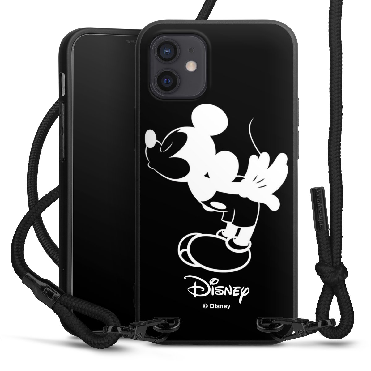 The matt black silicone case is made of flexible TPU (thermoplastic polyurethane) and offers robust protection. The durable, unbreakable material makes the cover flexible and dimensionally stable at the same time. The matte surface makes your design stand out more and is less susceptible to fingerprints and dirt. The stylish trend accessory fits comfortably in the hand and is perfectly complemented by the fabric (polyester) mobile phone strap. The braided fabric strap is approx. 1.70 metres long with a diameter of approx. 0.5 cm. Due to the special knotting technique, the length of the strap can be adjusted by simply pulling it, so that you can adapt it individually to your wishes. The practical case to wear around your neck is available with the fabric strap in black. As a little icing on the cake, we have provided the strap with a chic metal fastener in matt black. The strap is securely fastened to the case with loops made of high-quality genuine leather and press studs. The ends of the fabric strap are covered with metallic end caps and thus protected from fraying.