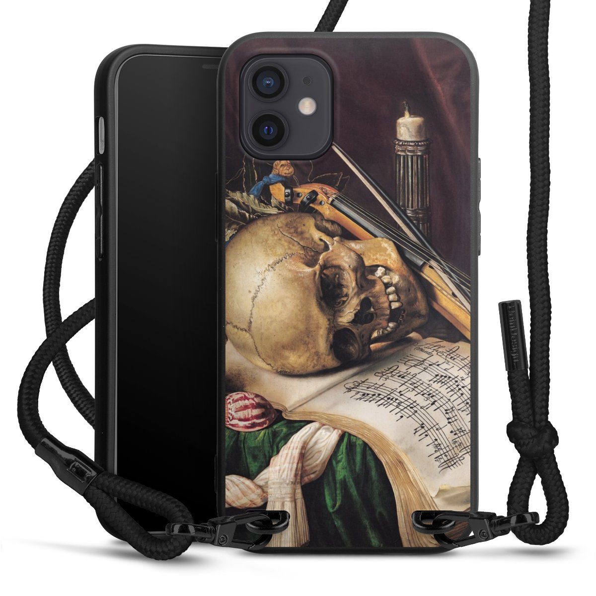 The matt black silicone case is made of flexible TPU (thermoplastic polyurethane) and offers robust protection. The durable, unbreakable material makes the cover flexible and dimensionally stable at the same time. The matte surface makes your design stand out more and is less susceptible to fingerprints and dirt. The stylish trend accessory fits comfortably in the hand and is perfectly complemented by the fabric (polyester) mobile phone strap. The braided fabric strap is approx. 1.70 metres long with a diameter of approx. 0.5 cm. Due to the special knotting technique, the length of the strap can be adjusted by simply pulling it, so that you can adapt it individually to your wishes. The practical case to wear around your neck is available with the fabric strap in black. As a little icing on the cake, we have provided the strap with a chic metal fastener in matt black. The strap is securely fastened to the case with loops made of high-quality genuine leather and press studs. The ends of the fabric strap are covered with metallic end caps and thus protected from fraying.