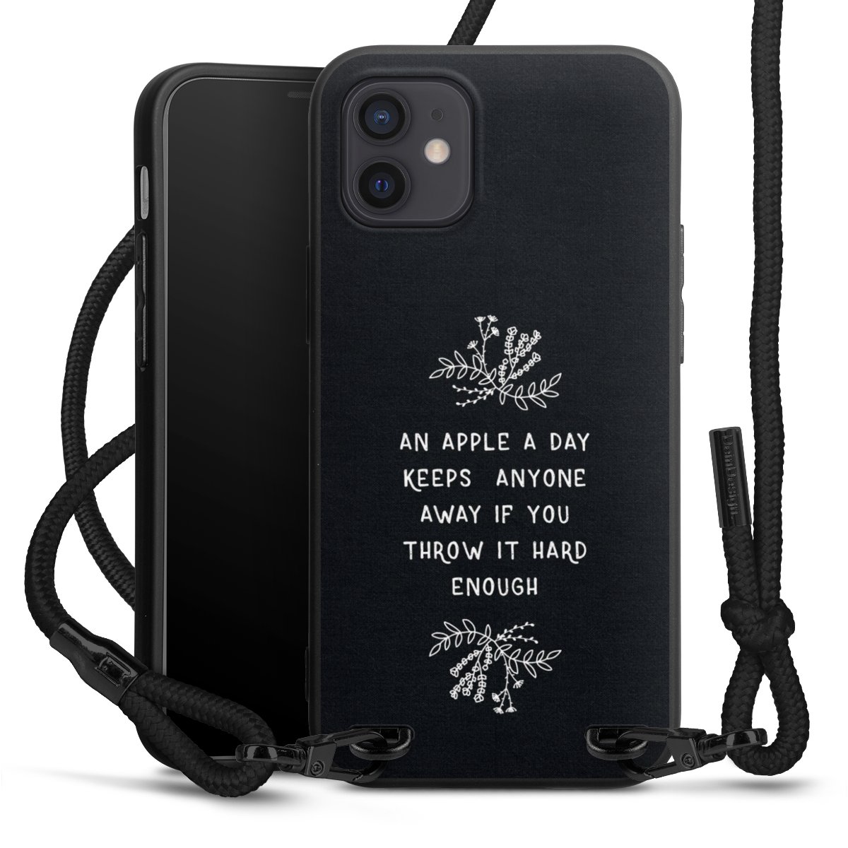 The matt black silicone case is made of flexible TPU (thermoplastic polyurethane) and offers robust protection. The durable, unbreakable material makes the cover flexible and dimensionally stable at the same time. The matte surface makes your design stand out more and is less susceptible to fingerprints and dirt. The stylish trend accessory fits comfortably in the hand and is perfectly complemented by the fabric (polyester) mobile phone strap. The braided fabric strap is approx. 1.70 metres long with a diameter of approx. 0.5 cm. Due to the special knotting technique, the length of the strap can be adjusted by simply pulling it, so that you can adapt it individually to your wishes. The practical case to wear around your neck is available with the fabric strap in black. As a little icing on the cake, we have provided the strap with a chic metal fastener in matt black. The strap is securely fastened to the case with loops made of high-quality genuine leather and press studs. The ends of the fabric strap are covered with metallic end caps and thus protected from fraying.