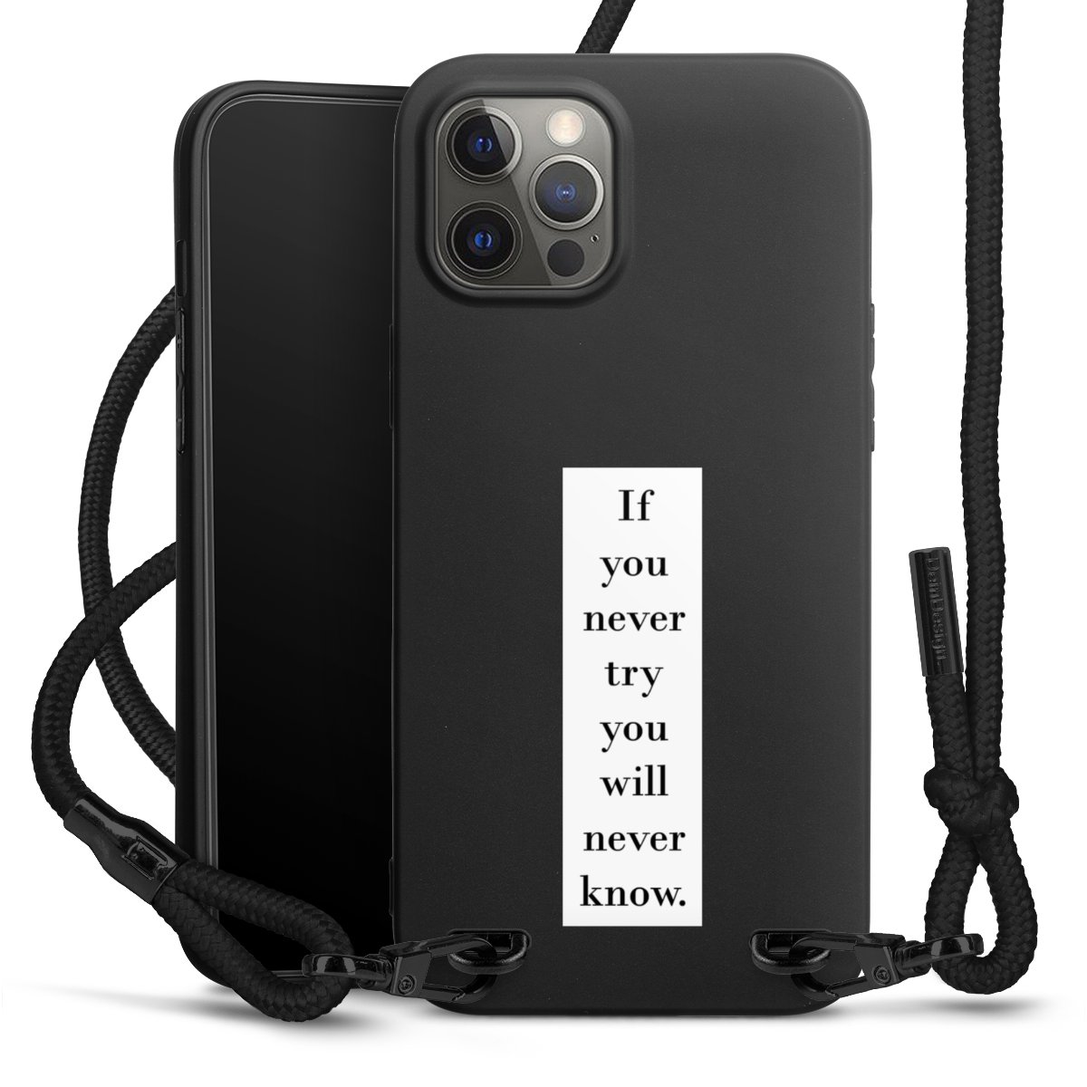 The matt black silicone case is made of flexible TPU (thermoplastic polyurethane) and offers robust protection. The durable, unbreakable material makes the cover flexible and dimensionally stable at the same time. The matte surface makes your design stand out more and is less susceptible to fingerprints and dirt. The stylish trend accessory fits comfortably in the hand and is perfectly complemented by the fabric (polyester) mobile phone strap. The braided fabric strap is approx. 1.70 metres long with a diameter of approx. 0.5 cm. Due to the special knotting technique, the length of the strap can be adjusted by simply pulling it, so that you can adapt it individually to your wishes. The practical case to wear around your neck is available with the fabric strap in black. As a little icing on the cake, we have provided the strap with a chic metal fastener in matt black. The strap is securely fastened to the case with loops made of high-quality genuine leather and press studs. The ends of the fabric strap are covered with metallic end caps and thus protected from fraying.