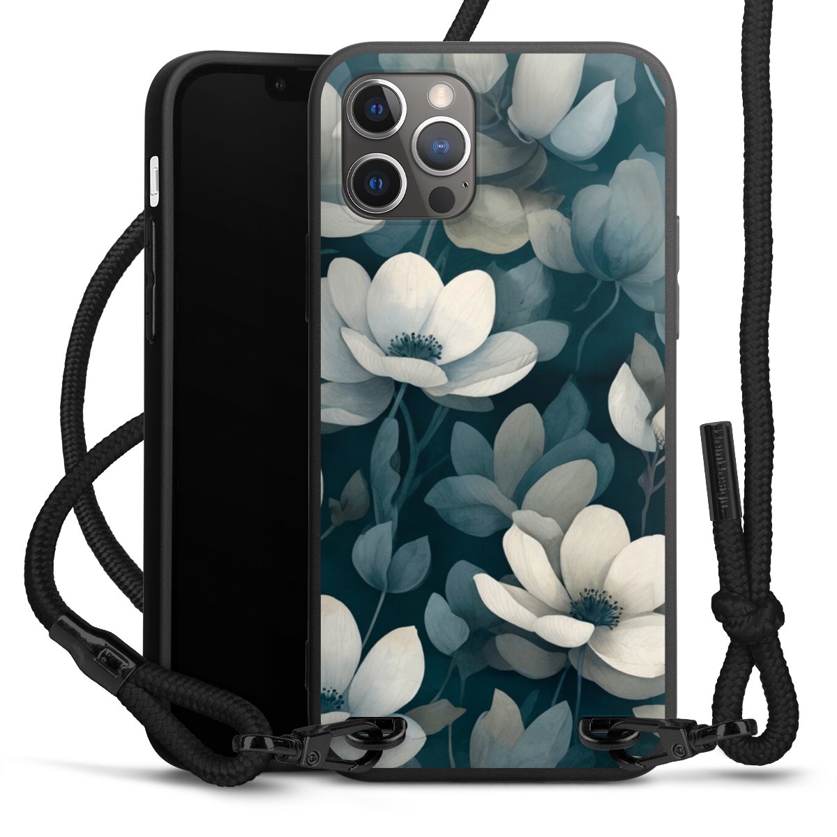 The matt black silicone case is made of flexible TPU (thermoplastic polyurethane) and offers robust protection. The durable, unbreakable material makes the cover flexible and dimensionally stable at the same time. The matte surface makes your design stand out more and is less susceptible to fingerprints and dirt. The stylish trend accessory fits comfortably in the hand and is perfectly complemented by the fabric (polyester) mobile phone strap. The braided fabric strap is approx. 1.70 metres long with a diameter of approx. 0.5 cm. Due to the special knotting technique, the length of the strap can be adjusted by simply pulling it, so that you can adapt it individually to your wishes. The practical case to wear around your neck is available with the fabric strap in black. As a little icing on the cake, we have provided the strap with a chic metal fastener in matt black. The strap is securely fastened to the case with loops made of high-quality genuine leather and press studs. The ends of the fabric strap are covered with metallic end caps and thus protected from fraying.