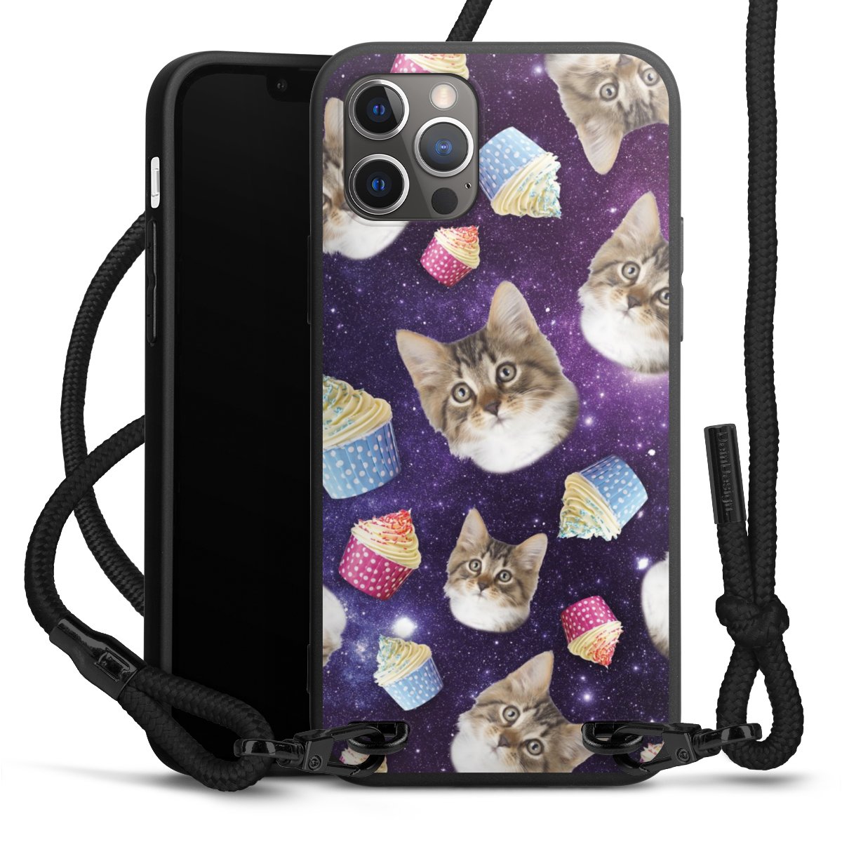 The matt black silicone case is made of flexible TPU (thermoplastic polyurethane) and offers robust protection. The durable, unbreakable material makes the cover flexible and dimensionally stable at the same time. The matte surface makes your design stand out more and is less susceptible to fingerprints and dirt. The stylish trend accessory fits comfortably in the hand and is perfectly complemented by the fabric (polyester) mobile phone strap. The braided fabric strap is approx. 1.70 metres long with a diameter of approx. 0.5 cm. Due to the special knotting technique, the length of the strap can be adjusted by simply pulling it, so that you can adapt it individually to your wishes. The practical case to wear around your neck is available with the fabric strap in black. As a little icing on the cake, we have provided the strap with a chic metal fastener in matt black. The strap is securely fastened to the case with loops made of high-quality genuine leather and press studs. The ends of the fabric strap are covered with metallic end caps and thus protected from fraying.