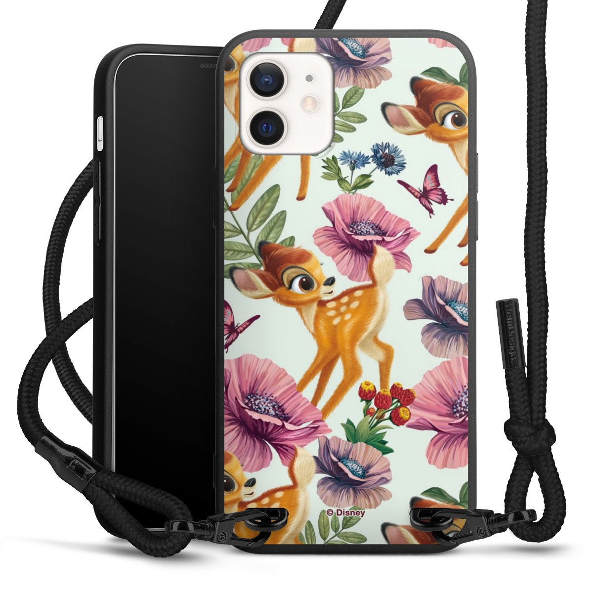 The matt black silicone case is made of flexible TPU (thermoplastic polyurethane) and offers robust protection. The durable, unbreakable material makes the cover flexible and dimensionally stable at the same time. The matte surface makes your design stand out more and is less susceptible to fingerprints and dirt. The stylish trend accessory fits comfortably in the hand and is perfectly complemented by the fabric (polyester) mobile phone strap. The braided fabric strap is approx. 1.70 metres long with a diameter of approx. 0.5 cm. Due to the special knotting technique, the length of the strap can be adjusted by simply pulling it, so that you can adapt it individually to your wishes. The practical case to wear around your neck is available with the fabric strap in black. As a little icing on the cake, we have provided the strap with a chic metal fastener in matt black. The strap is securely fastened to the case with loops made of high-quality genuine leather and press studs. The ends of the fabric strap are covered with metallic end caps and thus protected from fraying.