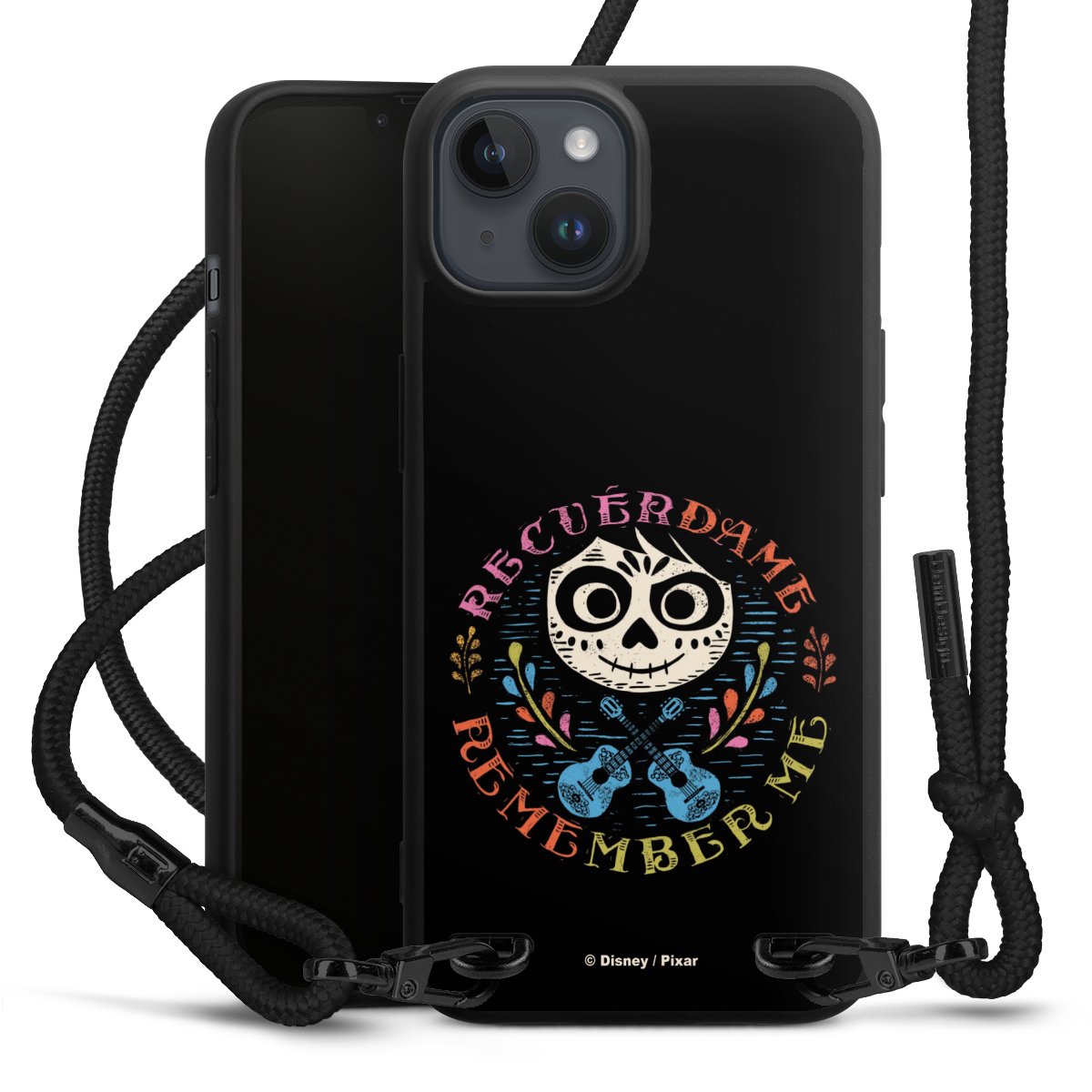 Pure Black: Phone case, fabric strap and metal details in stylish matt black.