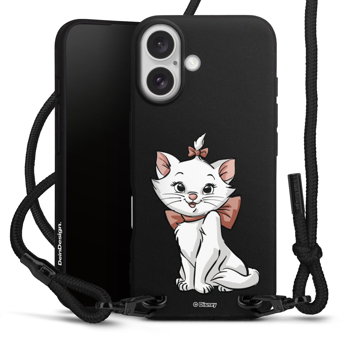 The matt black silicone case is made of flexible TPU (thermoplastic polyurethane) and offers robust protection. The durable, unbreakable material makes the cover flexible and dimensionally stable at the same time. The matte surface makes your design stand out more and is less susceptible to fingerprints and dirt. The stylish trend accessory fits comfortably in the hand and is perfectly complemented by the fabric (polyester) mobile phone strap. The braided fabric strap is approx. 1.70 metres long with a diameter of approx. 0.5 cm. Due to the special knotting technique, the length of the strap can be adjusted by simply pulling it, so that you can adapt it individually to your wishes. The practical case to wear around your neck is available with the fabric strap in black. As a little icing on the cake, we have provided the strap with a chic metal fastener in matt black. The strap is securely fastened to the case with loops made of high-quality genuine leather and press studs. The ends of the fabric strap are covered with metallic end caps and thus protected from fraying.