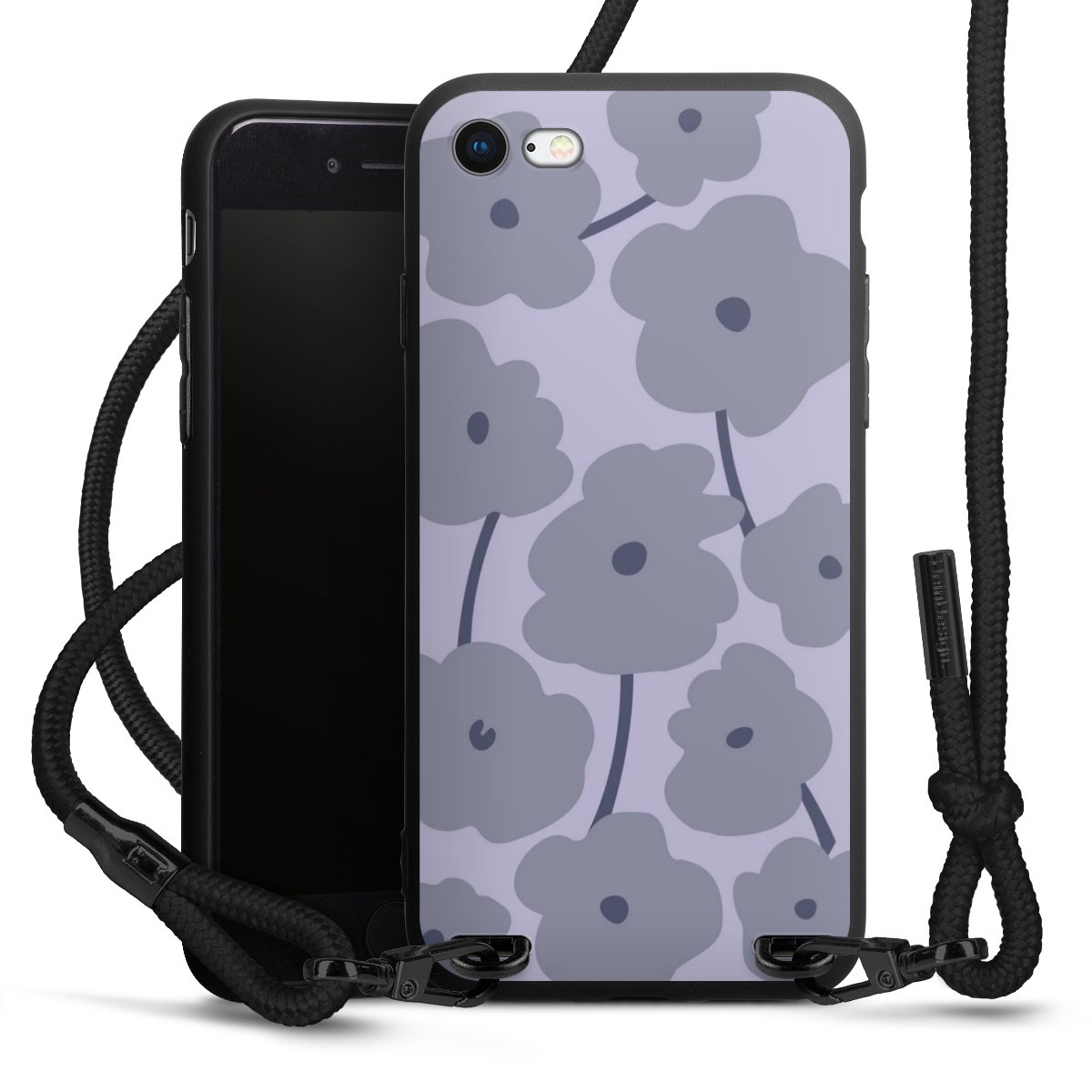 The matt black silicone case is made of flexible TPU (thermoplastic polyurethane) and offers robust protection. The durable, unbreakable material makes the cover flexible and dimensionally stable at the same time. The matte surface makes your design stand out more and is less susceptible to fingerprints and dirt. The stylish trend accessory fits comfortably in the hand and is perfectly complemented by the fabric (polyester) mobile phone strap. The braided fabric strap is approx. 1.70 metres long with a diameter of approx. 0.5 cm. Due to the special knotting technique, the length of the strap can be adjusted by simply pulling it, so that you can adapt it individually to your wishes. The practical case to wear around your neck is available with the fabric strap in black. As a little icing on the cake, we have provided the strap with a chic metal fastener in matt black. The strap is securely fastened to the case with loops made of high-quality genuine leather and press studs. The ends of the fabric strap are covered with metallic end caps and thus protected from fraying.