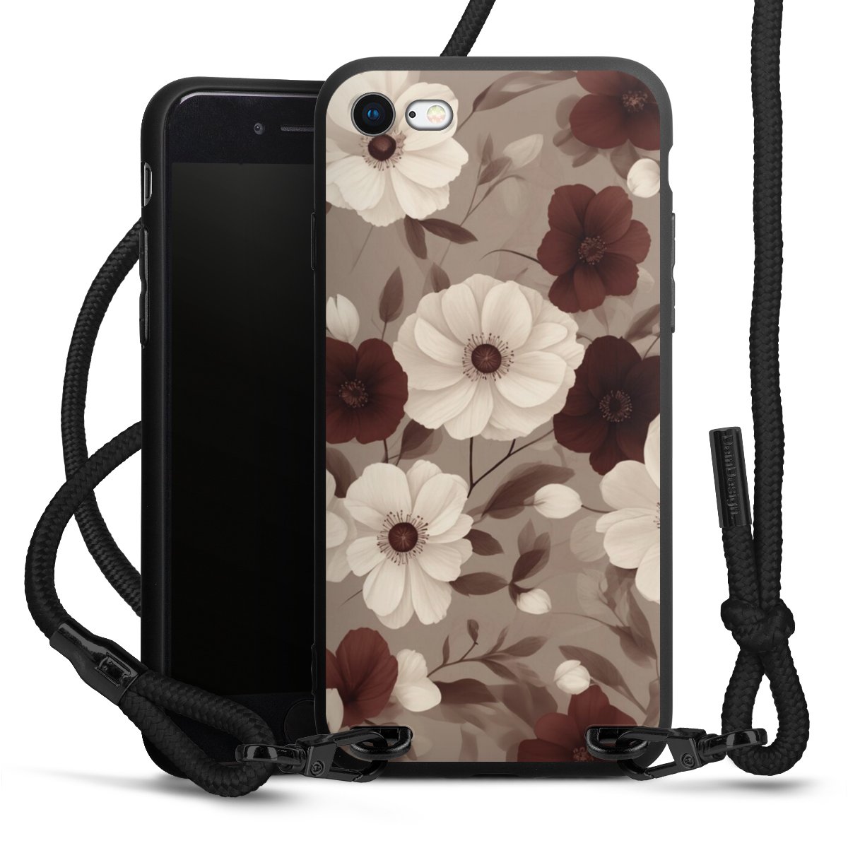 The matt black silicone case is made of flexible TPU (thermoplastic polyurethane) and offers robust protection. The durable, unbreakable material makes the cover flexible and dimensionally stable at the same time. The matte surface makes your design stand out more and is less susceptible to fingerprints and dirt. The stylish trend accessory fits comfortably in the hand and is perfectly complemented by the fabric (polyester) mobile phone strap. The braided fabric strap is approx. 1.70 metres long with a diameter of approx. 0.5 cm. Due to the special knotting technique, the length of the strap can be adjusted by simply pulling it, so that you can adapt it individually to your wishes. The practical case to wear around your neck is available with the fabric strap in black. As a little icing on the cake, we have provided the strap with a chic metal fastener in matt black. The strap is securely fastened to the case with loops made of high-quality genuine leather and press studs. The ends of the fabric strap are covered with metallic end caps and thus protected from fraying.