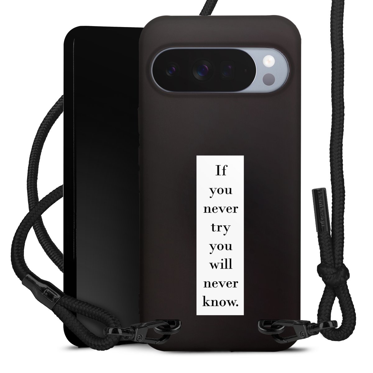 The matt black silicone case is made of flexible TPU (thermoplastic polyurethane) and offers robust protection. The durable, unbreakable material makes the cover flexible and dimensionally stable at the same time. The matte surface makes your design stand out more and is less susceptible to fingerprints and dirt. The stylish trend accessory fits comfortably in the hand and is perfectly complemented by the fabric (polyester) mobile phone strap. The braided fabric strap is approx. 1.70 metres long with a diameter of approx. 0.5 cm. Due to the special knotting technique, the length of the strap can be adjusted by simply pulling it, so that you can adapt it individually to your wishes. The practical case to wear around your neck is available with the fabric strap in black. As a little icing on the cake, we have provided the strap with a chic metal fastener in matt black. The strap is securely fastened to the case with loops made of high-quality genuine leather and press studs. The ends of the fabric strap are covered with metallic end caps and thus protected from fraying.
