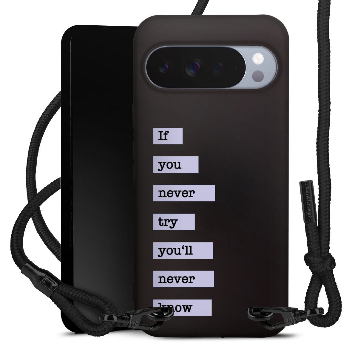 Pure Black: Phone case, fabric strap and metal details in stylish matt black.