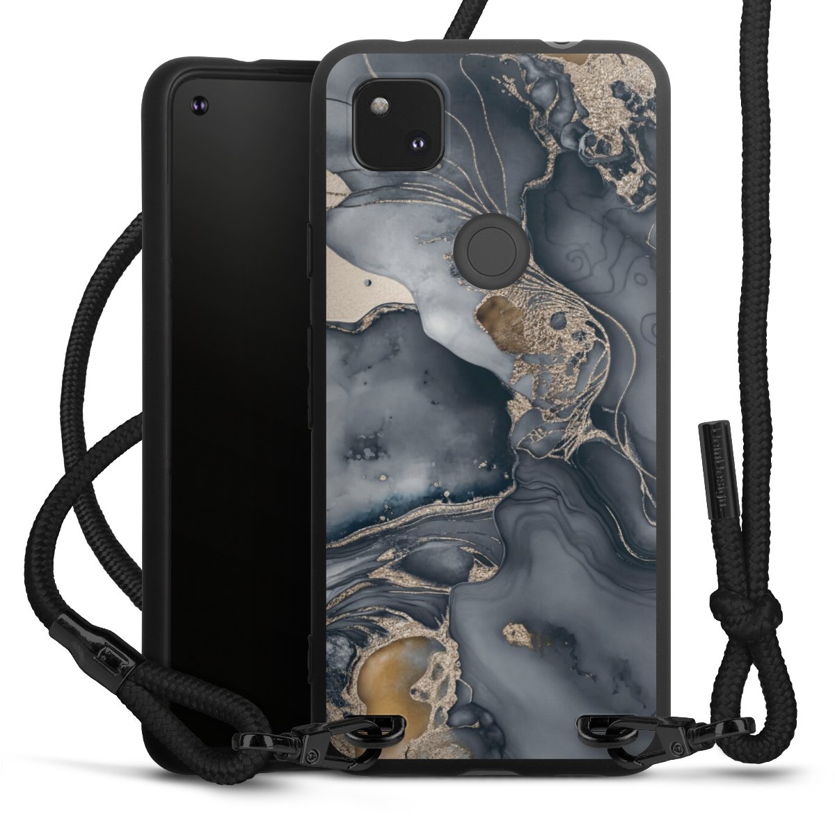 Pure Black: Phone case, fabric strap and metal details in stylish matt black.