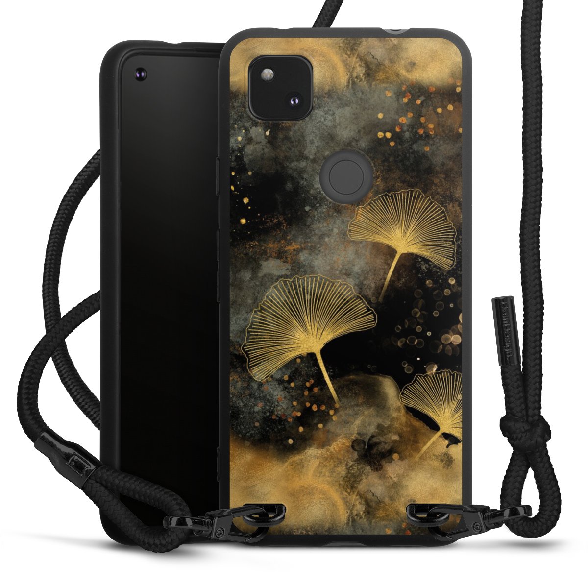 The matt black silicone case is made of flexible TPU (thermoplastic polyurethane) and offers robust protection. The durable, unbreakable material makes the cover flexible and dimensionally stable at the same time. The matte surface makes your design stand out more and is less susceptible to fingerprints and dirt. The stylish trend accessory fits comfortably in the hand and is perfectly complemented by the fabric (polyester) mobile phone strap. The braided fabric strap is approx. 1.70 metres long with a diameter of approx. 0.5 cm. Due to the special knotting technique, the length of the strap can be adjusted by simply pulling it, so that you can adapt it individually to your wishes. The practical case to wear around your neck is available with the fabric strap in black. As a little icing on the cake, we have provided the strap with a chic metal fastener in matt black. The strap is securely fastened to the case with loops made of high-quality genuine leather and press studs. The ends of the fabric strap are covered with metallic end caps and thus protected from fraying.