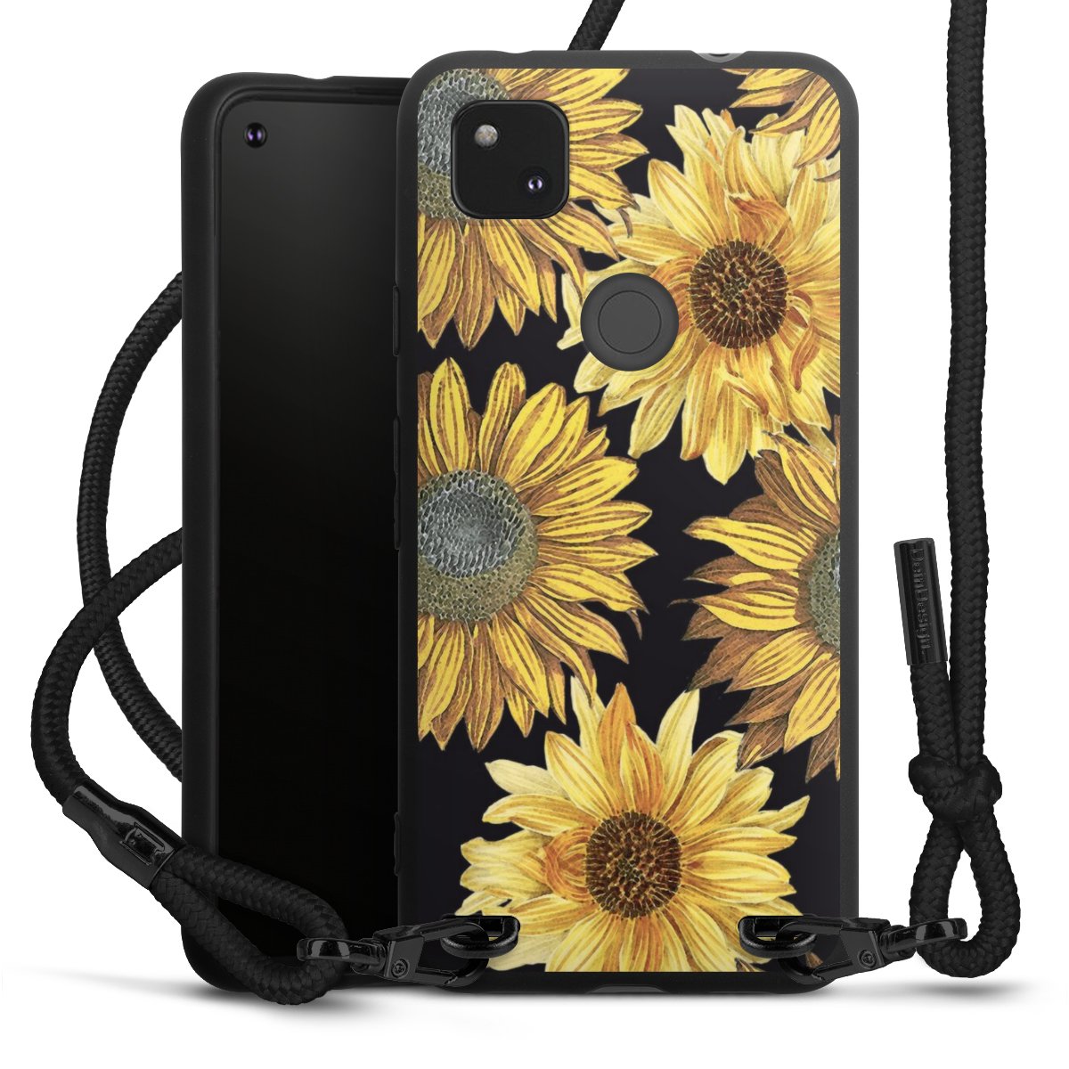 The matt black silicone case is made of flexible TPU (thermoplastic polyurethane) and offers robust protection. The durable, unbreakable material makes the cover flexible and dimensionally stable at the same time. The matte surface makes your design stand out more and is less susceptible to fingerprints and dirt. The stylish trend accessory fits comfortably in the hand and is perfectly complemented by the fabric (polyester) mobile phone strap. The braided fabric strap is approx. 1.70 metres long with a diameter of approx. 0.5 cm. Due to the special knotting technique, the length of the strap can be adjusted by simply pulling it, so that you can adapt it individually to your wishes. The practical case to wear around your neck is available with the fabric strap in black. As a little icing on the cake, we have provided the strap with a chic metal fastener in matt black. The strap is securely fastened to the case with loops made of high-quality genuine leather and press studs. The ends of the fabric strap are covered with metallic end caps and thus protected from fraying.
