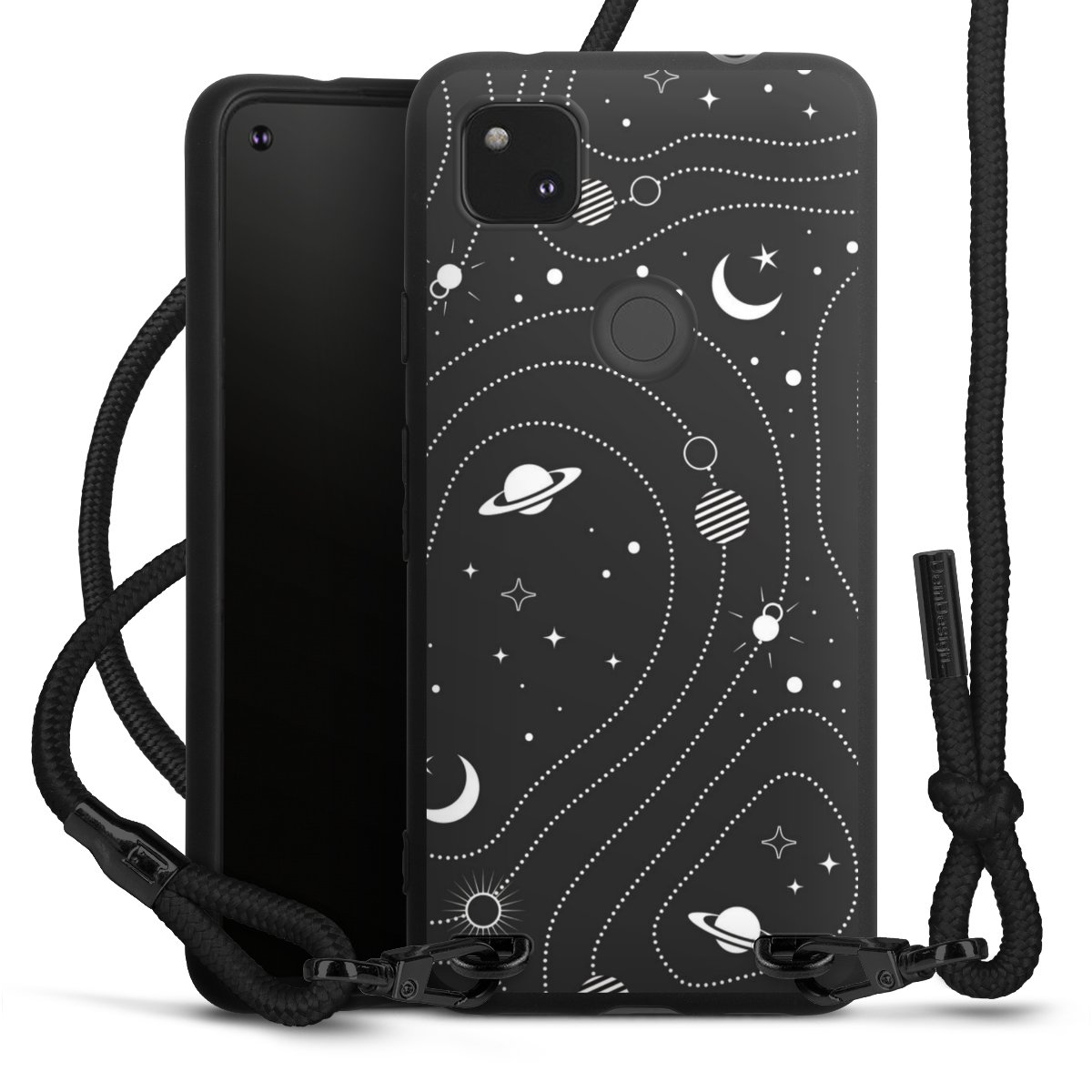 The matt black silicone case is made of flexible TPU (thermoplastic polyurethane) and offers robust protection. The durable, unbreakable material makes the cover flexible and dimensionally stable at the same time. The matte surface makes your design stand out more and is less susceptible to fingerprints and dirt. The stylish trend accessory fits comfortably in the hand and is perfectly complemented by the fabric (polyester) mobile phone strap. The braided fabric strap is approx. 1.70 metres long with a diameter of approx. 0.5 cm. Due to the special knotting technique, the length of the strap can be adjusted by simply pulling it, so that you can adapt it individually to your wishes. The practical case to wear around your neck is available with the fabric strap in black. As a little icing on the cake, we have provided the strap with a chic metal fastener in matt black. The strap is securely fastened to the case with loops made of high-quality genuine leather and press studs. The ends of the fabric strap are covered with metallic end caps and thus protected from fraying.