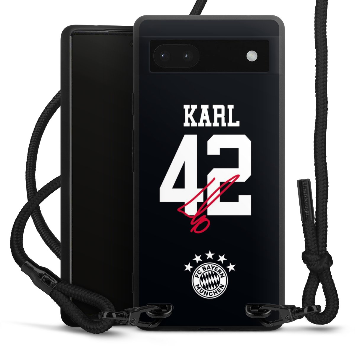 The matt black silicone case is made of flexible TPU (thermoplastic polyurethane) and offers robust protection. The durable, unbreakable material makes the cover flexible and dimensionally stable at the same time. The matte surface makes your design stand out more and is less susceptible to fingerprints and dirt. The stylish trend accessory fits comfortably in the hand and is perfectly complemented by the fabric (polyester) mobile phone strap. The braided fabric strap is approx. 1.70 metres long with a diameter of approx. 0.5 cm. Due to the special knotting technique, the length of the strap can be adjusted by simply pulling it, so that you can adapt it individually to your wishes. The practical case to wear around your neck is available with the fabric strap in black. As a little icing on the cake, we have provided the strap with a chic metal fastener in matt black. The strap is securely fastened to the case with loops made of high-quality genuine leather and press studs. The ends of the fabric strap are covered with metallic end caps and thus protected from fraying.