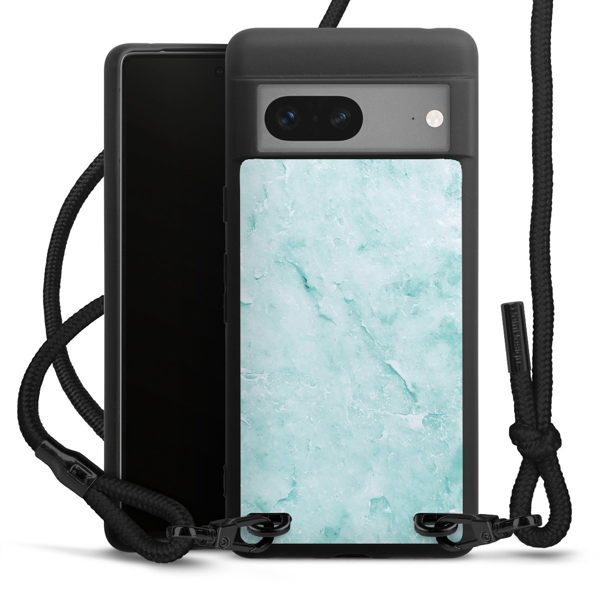 The matt black silicone case is made of flexible TPU (thermoplastic polyurethane) and offers robust protection. The durable, unbreakable material makes the cover flexible and dimensionally stable at the same time. The matte surface makes your design stand out more and is less susceptible to fingerprints and dirt. The stylish trend accessory fits comfortably in the hand and is perfectly complemented by the fabric (polyester) mobile phone strap. The braided fabric strap is approx. 1.70 metres long with a diameter of approx. 0.5 cm. Due to the special knotting technique, the length of the strap can be adjusted by simply pulling it, so that you can adapt it individually to your wishes. The practical case to wear around your neck is available with the fabric strap in black. As a little icing on the cake, we have provided the strap with a chic metal fastener in matt black. The strap is securely fastened to the case with loops made of high-quality genuine leather and press studs. The ends of the fabric strap are covered with metallic end caps and thus protected from fraying.