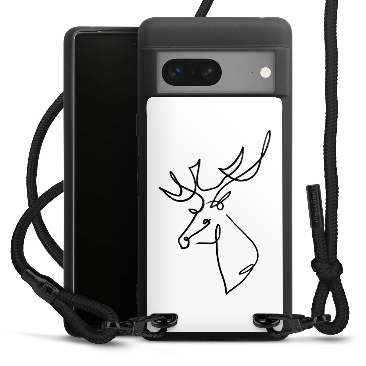 The matt black silicone case is made of flexible TPU (thermoplastic polyurethane) and offers robust protection. The durable, unbreakable material makes the cover flexible and dimensionally stable at the same time. The matte surface makes your design stand out more and is less susceptible to fingerprints and dirt. The stylish trend accessory fits comfortably in the hand and is perfectly complemented by the fabric (polyester) mobile phone strap. The braided fabric strap is approx. 1.70 metres long with a diameter of approx. 0.5 cm. Due to the special knotting technique, the length of the strap can be adjusted by simply pulling it, so that you can adapt it individually to your wishes. The practical case to wear around your neck is available with the fabric strap in black. As a little icing on the cake, we have provided the strap with a chic metal fastener in matt black. The strap is securely fastened to the case with loops made of high-quality genuine leather and press studs. The ends of the fabric strap are covered with metallic end caps and thus protected from fraying.