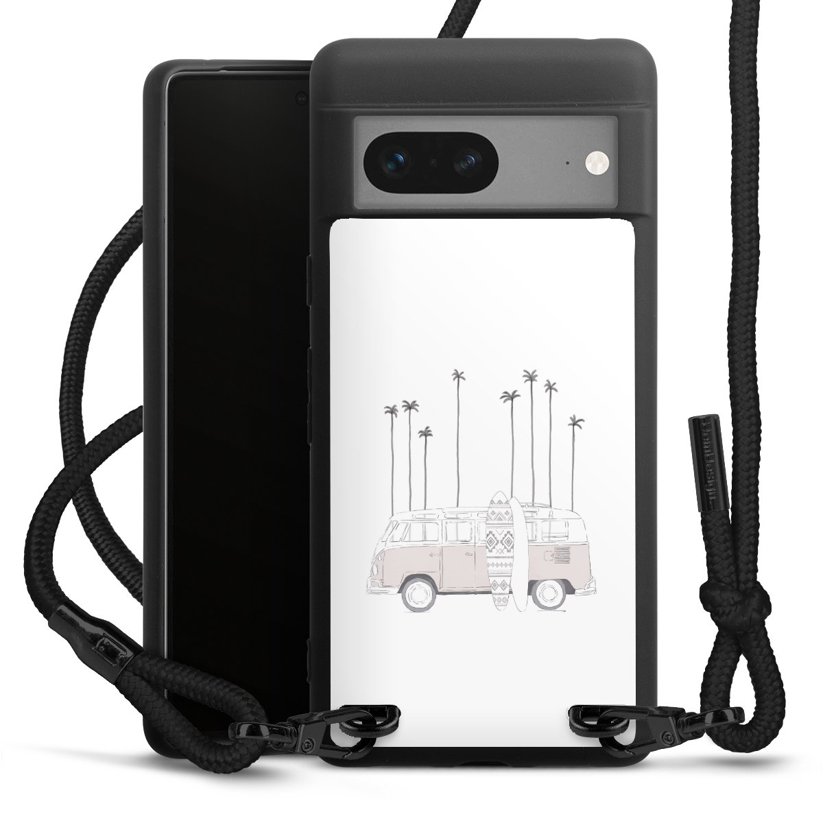 We use the solid direct print process for this phone case, which is why the print area only covers the back and the edge remains unprinted. The case to wear around your neck can be ordered unprinted, fully printed, or partially printed. For your design, either choose one of our exclusive shop motifs or get creative and create your own design, for example with photos and overlays. Design your own personal trend accessory and make an individual statement on the streets!