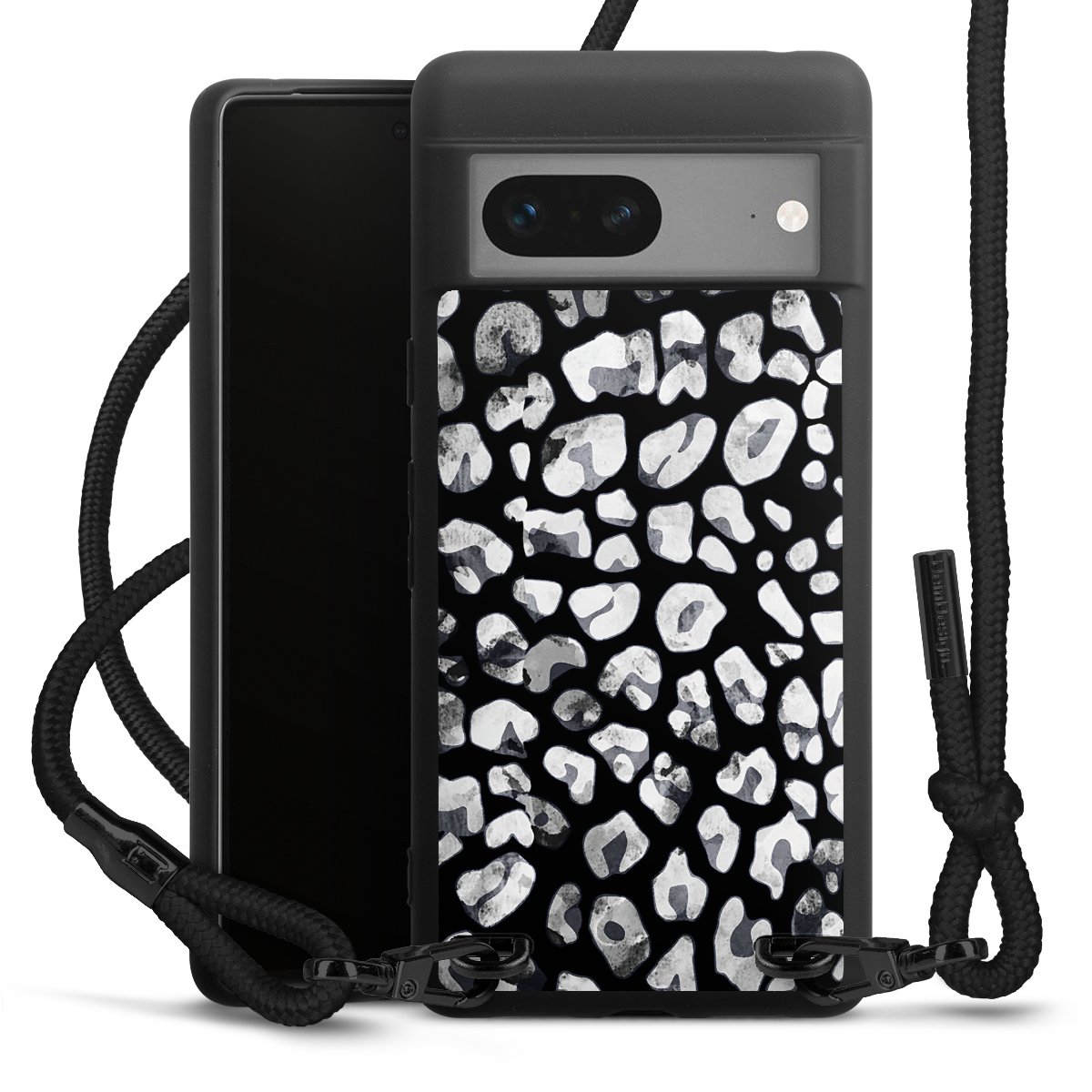 The matt black silicone case is made of flexible TPU (thermoplastic polyurethane) and offers robust protection. The durable, unbreakable material makes the cover flexible and dimensionally stable at the same time. The matte surface makes your design stand out more and is less susceptible to fingerprints and dirt. The stylish trend accessory fits comfortably in the hand and is perfectly complemented by the fabric (polyester) mobile phone strap. The braided fabric strap is approx. 1.70 metres long with a diameter of approx. 0.5 cm. Due to the special knotting technique, the length of the strap can be adjusted by simply pulling it, so that you can adapt it individually to your wishes. The practical case to wear around your neck is available with the fabric strap in black. As a little icing on the cake, we have provided the strap with a chic metal fastener in matt black. The strap is securely fastened to the case with loops made of high-quality genuine leather and press studs. The ends of the fabric strap are covered with metallic end caps and thus protected from fraying.