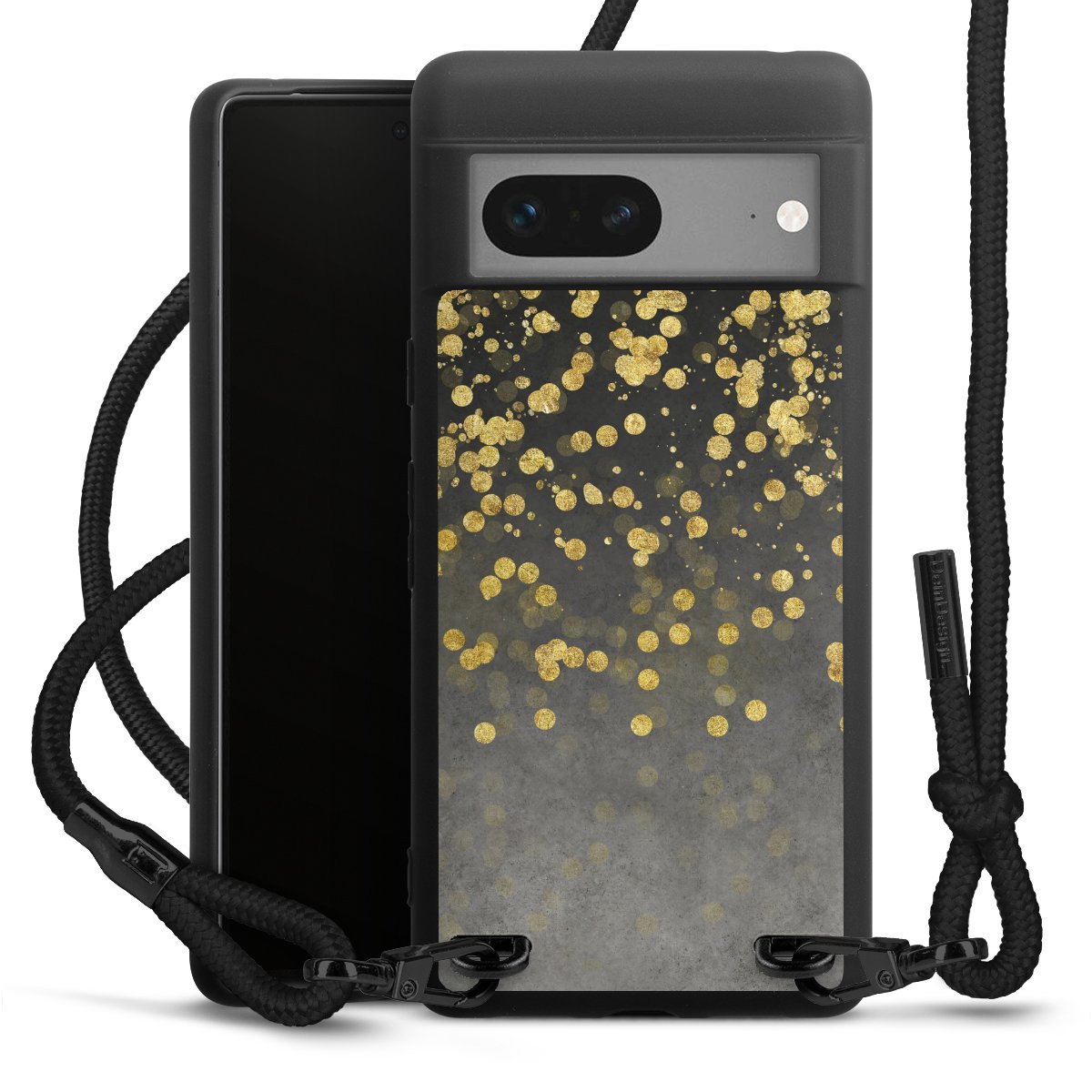 The matt black silicone case is made of flexible TPU (thermoplastic polyurethane) and offers robust protection. The durable, unbreakable material makes the cover flexible and dimensionally stable at the same time. The matte surface makes your design stand out more and is less susceptible to fingerprints and dirt. The stylish trend accessory fits comfortably in the hand and is perfectly complemented by the fabric (polyester) mobile phone strap. The braided fabric strap is approx. 1.70 metres long with a diameter of approx. 0.5 cm. Due to the special knotting technique, the length of the strap can be adjusted by simply pulling it, so that you can adapt it individually to your wishes. The practical case to wear around your neck is available with the fabric strap in black. As a little icing on the cake, we have provided the strap with a chic metal fastener in matt black. The strap is securely fastened to the case with loops made of high-quality genuine leather and press studs. The ends of the fabric strap are covered with metallic end caps and thus protected from fraying.