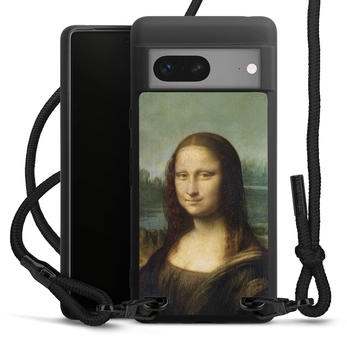 The matt black silicone case is made of flexible TPU (thermoplastic polyurethane) and offers robust protection. The durable, unbreakable material makes the cover flexible and dimensionally stable at the same time. The matte surface makes your design stand out more and is less susceptible to fingerprints and dirt. The stylish trend accessory fits comfortably in the hand and is perfectly complemented by the fabric (polyester) mobile phone strap. The braided fabric strap is approx. 1.70 metres long with a diameter of approx. 0.5 cm. Due to the special knotting technique, the length of the strap can be adjusted by simply pulling it, so that you can adapt it individually to your wishes. The practical case to wear around your neck is available with the fabric strap in black. As a little icing on the cake, we have provided the strap with a chic metal fastener in matt black. The strap is securely fastened to the case with loops made of high-quality genuine leather and press studs. The ends of the fabric strap are covered with metallic end caps and thus protected from fraying.