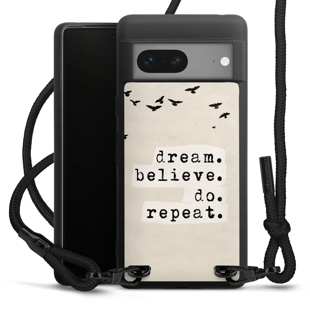 We use the solid direct print process for this phone case, which is why the print area only covers the back and the edge remains unprinted. The case to wear around your neck can be ordered unprinted, fully printed, or partially printed. For your design, either choose one of our exclusive shop motifs or get creative and create your own design, for example with photos and overlays. Design your own personal trend accessory and make an individual statement on the streets!