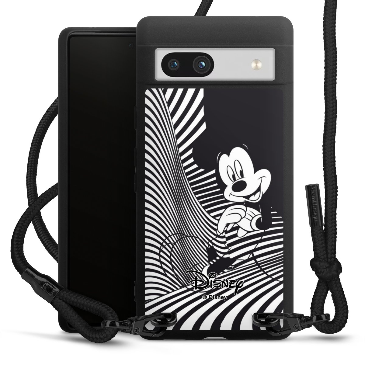 The matt black silicone case is made of flexible TPU (thermoplastic polyurethane) and offers robust protection. The durable, unbreakable material makes the cover flexible and dimensionally stable at the same time. The matte surface makes your design stand out more and is less susceptible to fingerprints and dirt. The stylish trend accessory fits comfortably in the hand and is perfectly complemented by the fabric (polyester) mobile phone strap. The braided fabric strap is approx. 1.70 metres long with a diameter of approx. 0.5 cm. Due to the special knotting technique, the length of the strap can be adjusted by simply pulling it, so that you can adapt it individually to your wishes. The practical case to wear around your neck is available with the fabric strap in black. As a little icing on the cake, we have provided the strap with a chic metal fastener in matt black. The strap is securely fastened to the case with loops made of high-quality genuine leather and press studs. The ends of the fabric strap are covered with metallic end caps and thus protected from fraying.