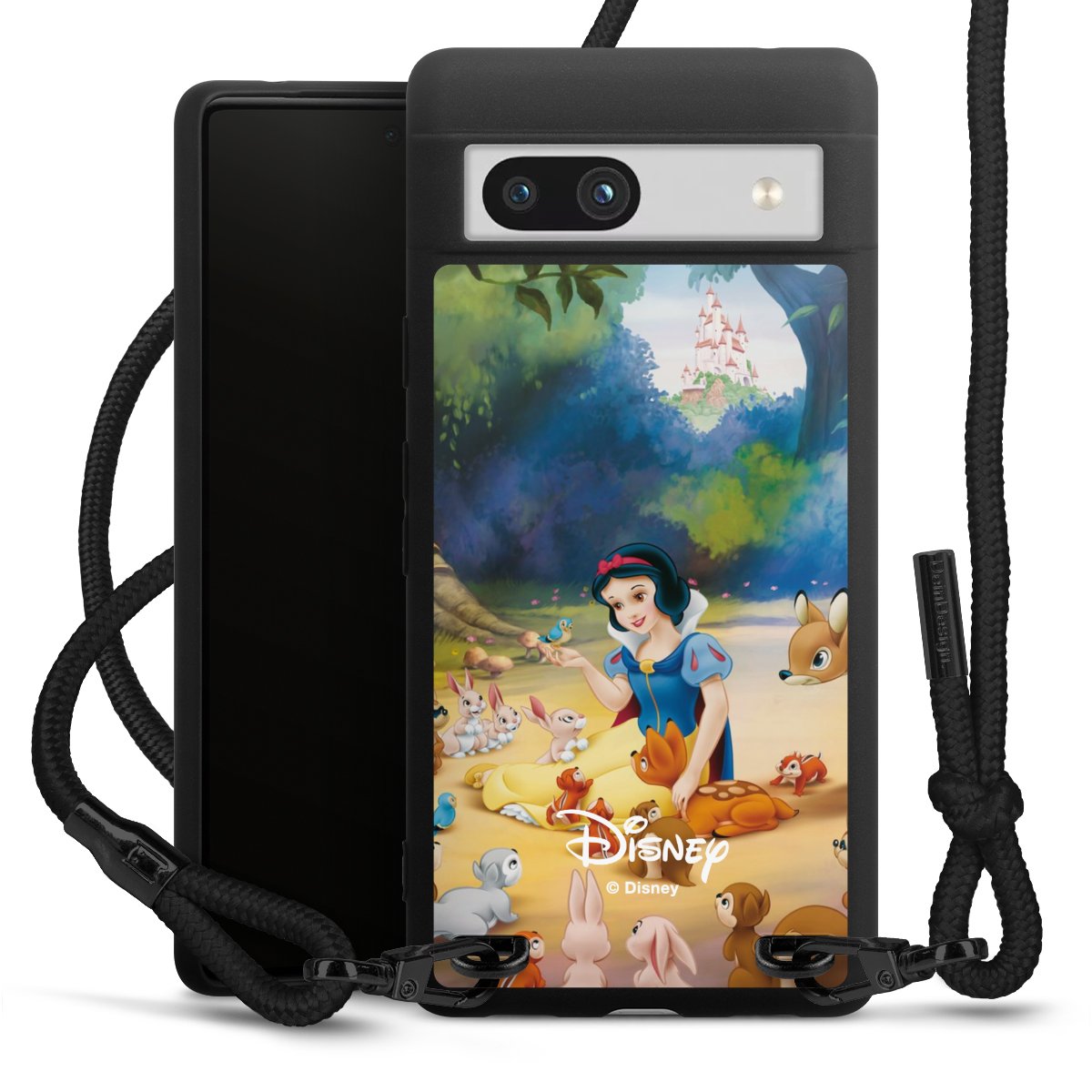 The matt black silicone case is made of flexible TPU (thermoplastic polyurethane) and offers robust protection. The durable, unbreakable material makes the cover flexible and dimensionally stable at the same time. The matte surface makes your design stand out more and is less susceptible to fingerprints and dirt. The stylish trend accessory fits comfortably in the hand and is perfectly complemented by the fabric (polyester) mobile phone strap. The braided fabric strap is approx. 1.70 metres long with a diameter of approx. 0.5 cm. Due to the special knotting technique, the length of the strap can be adjusted by simply pulling it, so that you can adapt it individually to your wishes. The practical case to wear around your neck is available with the fabric strap in black. As a little icing on the cake, we have provided the strap with a chic metal fastener in matt black. The strap is securely fastened to the case with loops made of high-quality genuine leather and press studs. The ends of the fabric strap are covered with metallic end caps and thus protected from fraying.