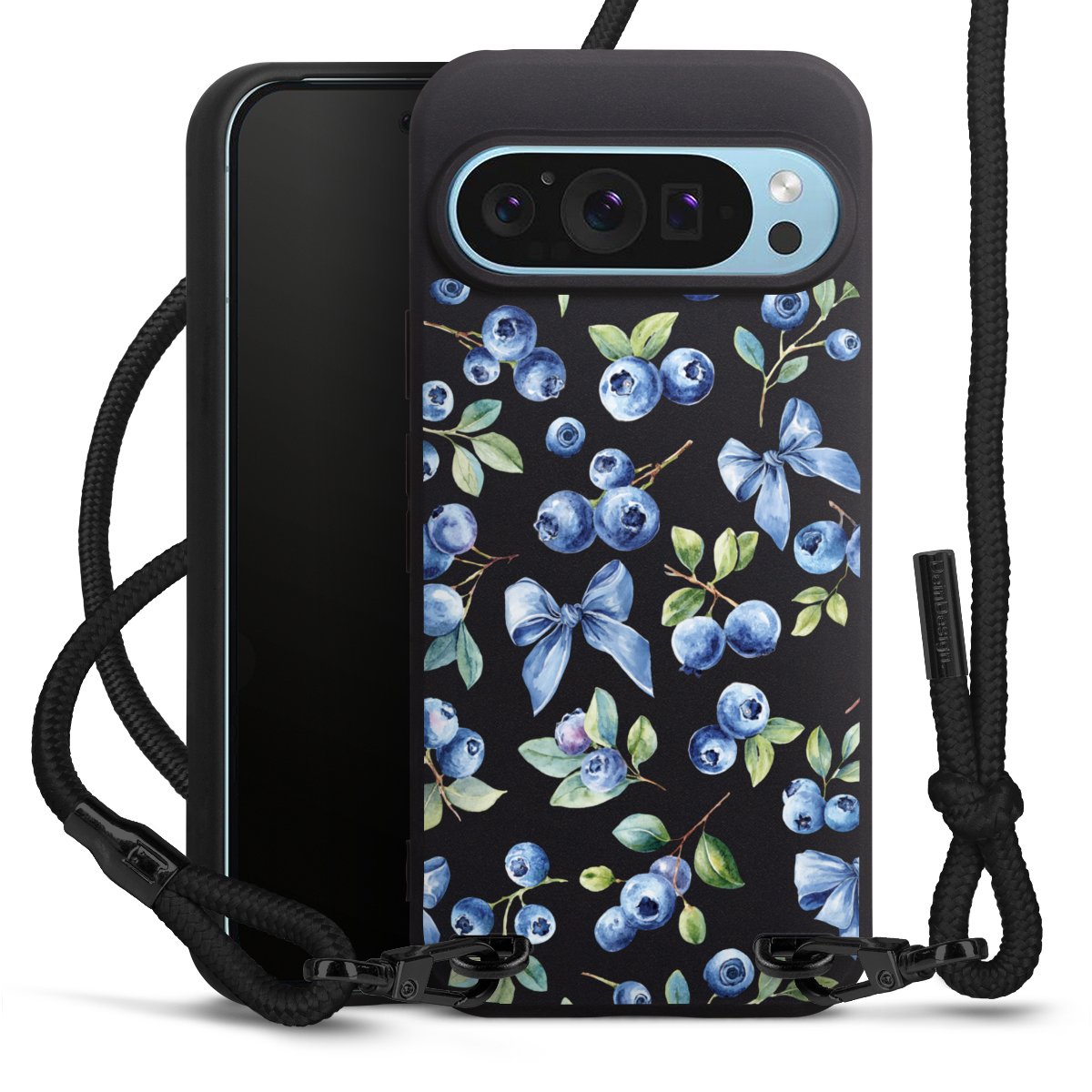 Pure Black: Phone case, fabric strap and metal details in stylish matt black.