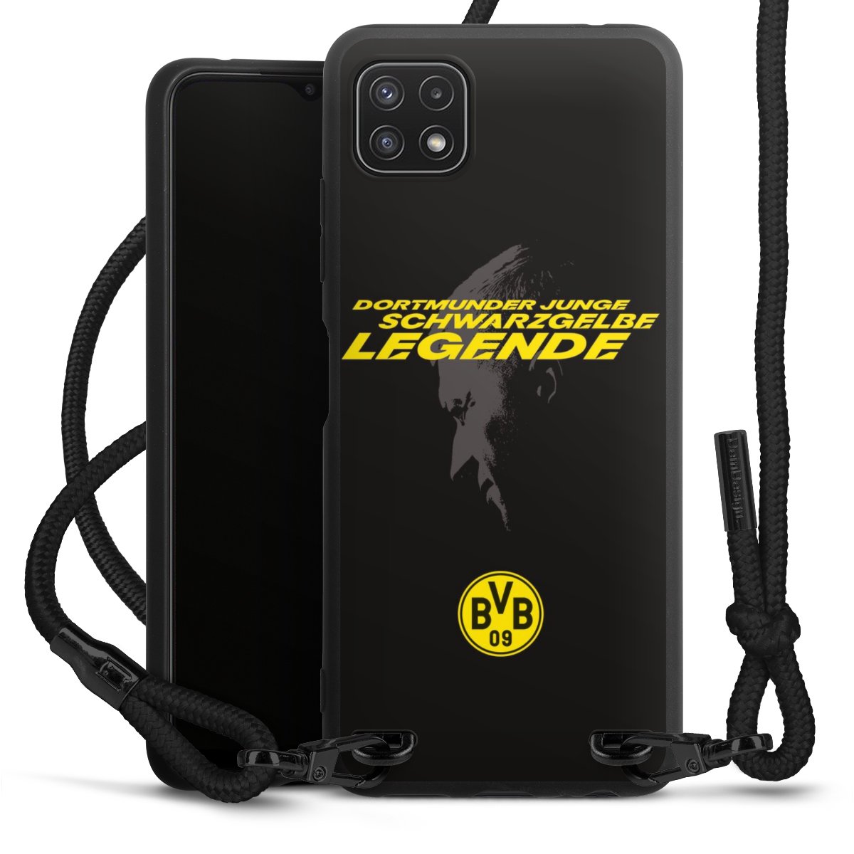 The matt black silicone case is made of flexible TPU (thermoplastic polyurethane) and offers robust protection. The durable, unbreakable material makes the cover flexible and dimensionally stable at the same time. The matte surface makes your design stand out more and is less susceptible to fingerprints and dirt. The stylish trend accessory fits comfortably in the hand and is perfectly complemented by the fabric (polyester) mobile phone strap. The braided fabric strap is approx. 1.70 metres long with a diameter of approx. 0.5 cm. Due to the special knotting technique, the length of the strap can be adjusted by simply pulling it, so that you can adapt it individually to your wishes. The practical case to wear around your neck is available with the fabric strap in black. As a little icing on the cake, we have provided the strap with a chic metal fastener in matt black. The strap is securely fastened to the case with loops made of high-quality genuine leather and press studs. The ends of the fabric strap are covered with metallic end caps and thus protected from fraying.