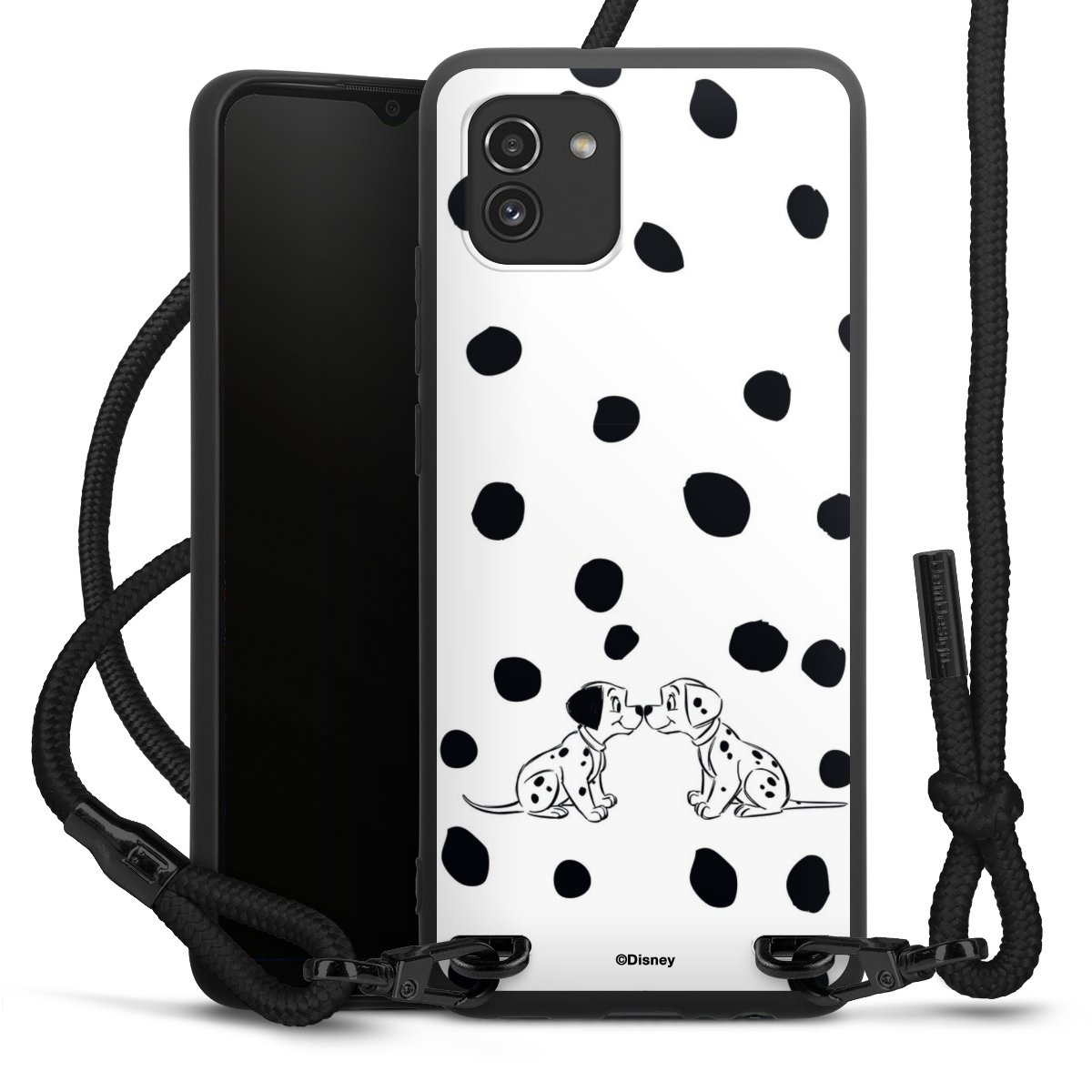 The matt black silicone case is made of flexible TPU (thermoplastic polyurethane) and offers robust protection. The durable, unbreakable material makes the cover flexible and dimensionally stable at the same time. The matte surface makes your design stand out more and is less susceptible to fingerprints and dirt. The stylish trend accessory fits comfortably in the hand and is perfectly complemented by the fabric (polyester) mobile phone strap. The braided fabric strap is approx. 1.70 metres long with a diameter of approx. 0.5 cm. Due to the special knotting technique, the length of the strap can be adjusted by simply pulling it, so that you can adapt it individually to your wishes. The practical case to wear around your neck is available with the fabric strap in black. As a little icing on the cake, we have provided the strap with a chic metal fastener in matt black. The strap is securely fastened to the case with loops made of high-quality genuine leather and press studs. The ends of the fabric strap are covered with metallic end caps and thus protected from fraying.