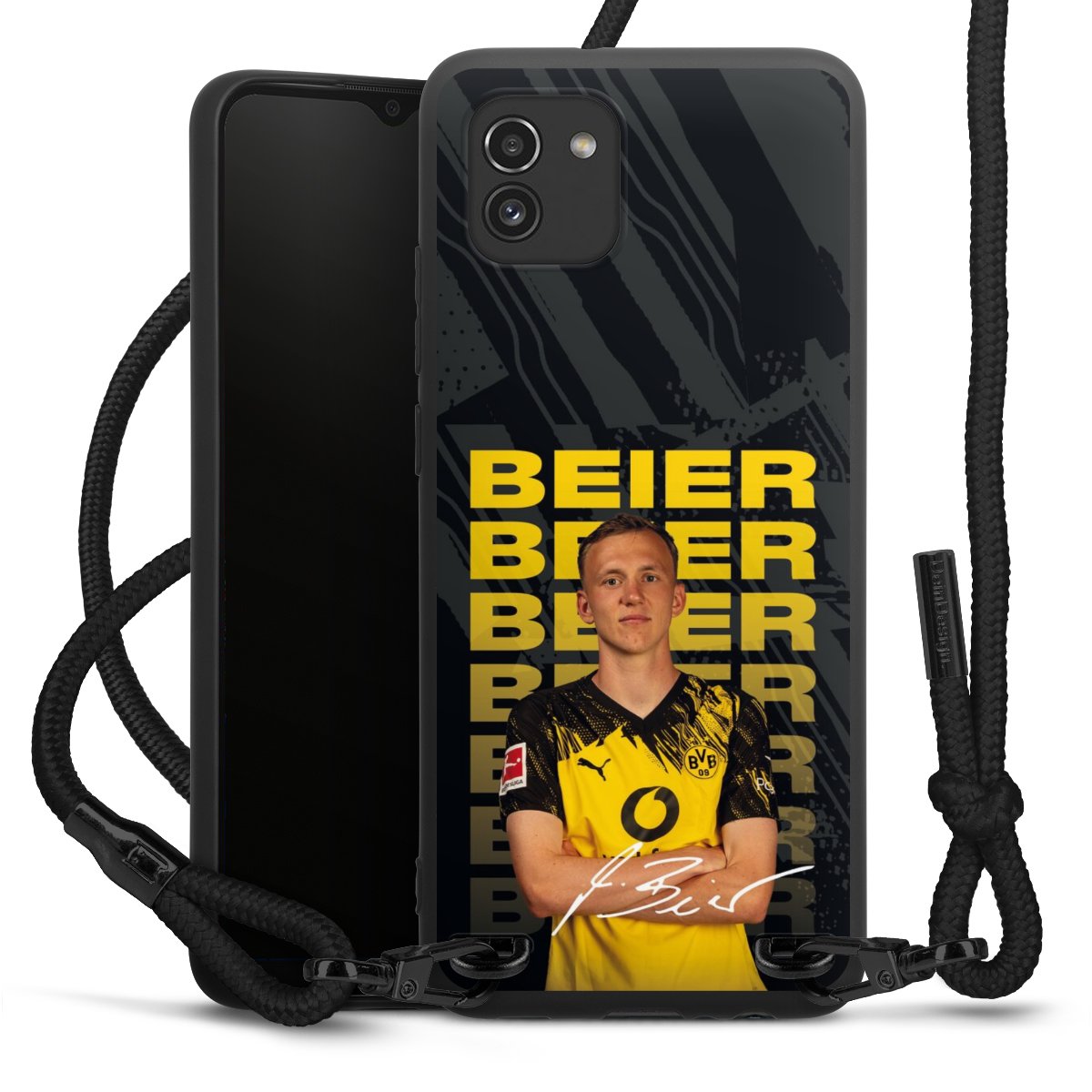 The matt black silicone case is made of flexible TPU (thermoplastic polyurethane) and offers robust protection. The durable, unbreakable material makes the cover flexible and dimensionally stable at the same time. The matte surface makes your design stand out more and is less susceptible to fingerprints and dirt. The stylish trend accessory fits comfortably in the hand and is perfectly complemented by the fabric (polyester) mobile phone strap. The braided fabric strap is approx. 1.70 metres long with a diameter of approx. 0.5 cm. Due to the special knotting technique, the length of the strap can be adjusted by simply pulling it, so that you can adapt it individually to your wishes. The practical case to wear around your neck is available with the fabric strap in black. As a little icing on the cake, we have provided the strap with a chic metal fastener in matt black. The strap is securely fastened to the case with loops made of high-quality genuine leather and press studs. The ends of the fabric strap are covered with metallic end caps and thus protected from fraying.