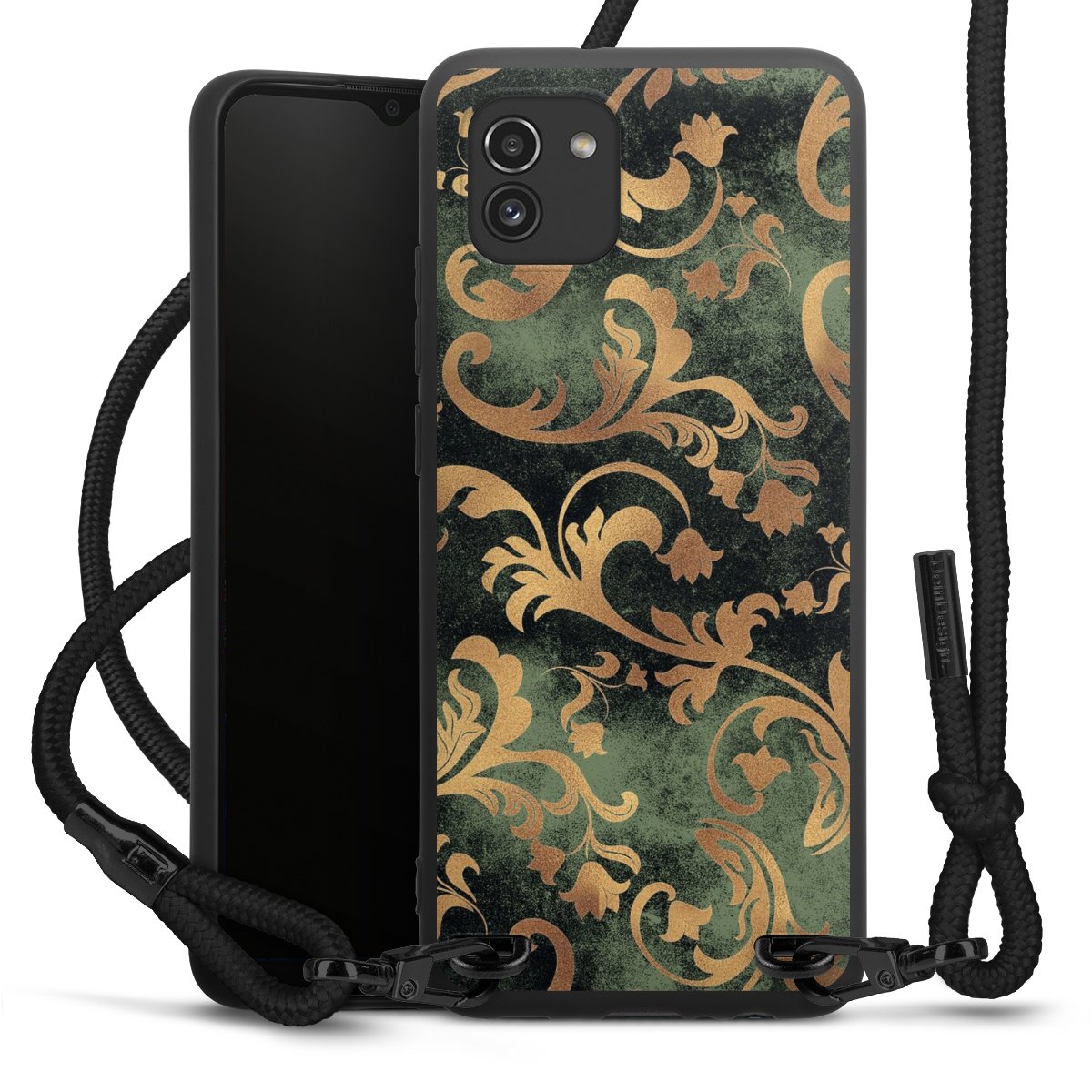 The matt black silicone case is made of flexible TPU (thermoplastic polyurethane) and offers robust protection. The durable, unbreakable material makes the cover flexible and dimensionally stable at the same time. The matte surface makes your design stand out more and is less susceptible to fingerprints and dirt. The stylish trend accessory fits comfortably in the hand and is perfectly complemented by the fabric (polyester) mobile phone strap. The braided fabric strap is approx. 1.70 metres long with a diameter of approx. 0.5 cm. Due to the special knotting technique, the length of the strap can be adjusted by simply pulling it, so that you can adapt it individually to your wishes. The practical case to wear around your neck is available with the fabric strap in black. As a little icing on the cake, we have provided the strap with a chic metal fastener in matt black. The strap is securely fastened to the case with loops made of high-quality genuine leather and press studs. The ends of the fabric strap are covered with metallic end caps and thus protected from fraying.
