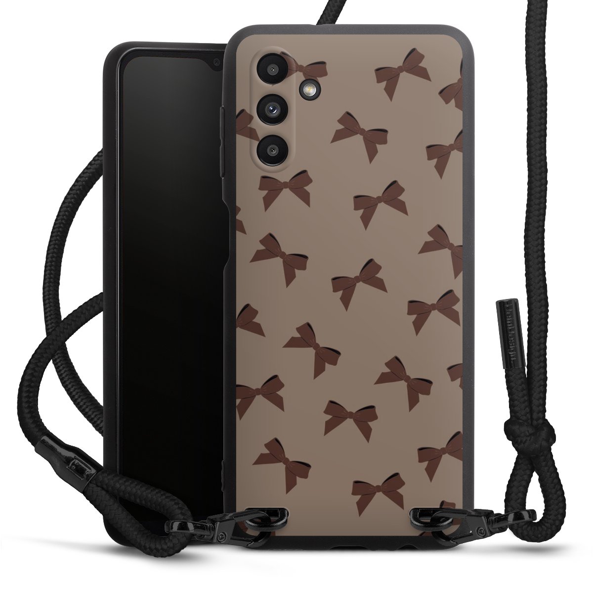 The matt black silicone case is made of flexible TPU (thermoplastic polyurethane) and offers robust protection. The durable, unbreakable material makes the cover flexible and dimensionally stable at the same time. The matte surface makes your design stand out more and is less susceptible to fingerprints and dirt. The stylish trend accessory fits comfortably in the hand and is perfectly complemented by the fabric (polyester) mobile phone strap. The braided fabric strap is approx. 1.70 metres long with a diameter of approx. 0.5 cm. Due to the special knotting technique, the length of the strap can be adjusted by simply pulling it, so that you can adapt it individually to your wishes. The practical case to wear around your neck is available with the fabric strap in black. As a little icing on the cake, we have provided the strap with a chic metal fastener in matt black. The strap is securely fastened to the case with loops made of high-quality genuine leather and press studs. The ends of the fabric strap are covered with metallic end caps and thus protected from fraying.