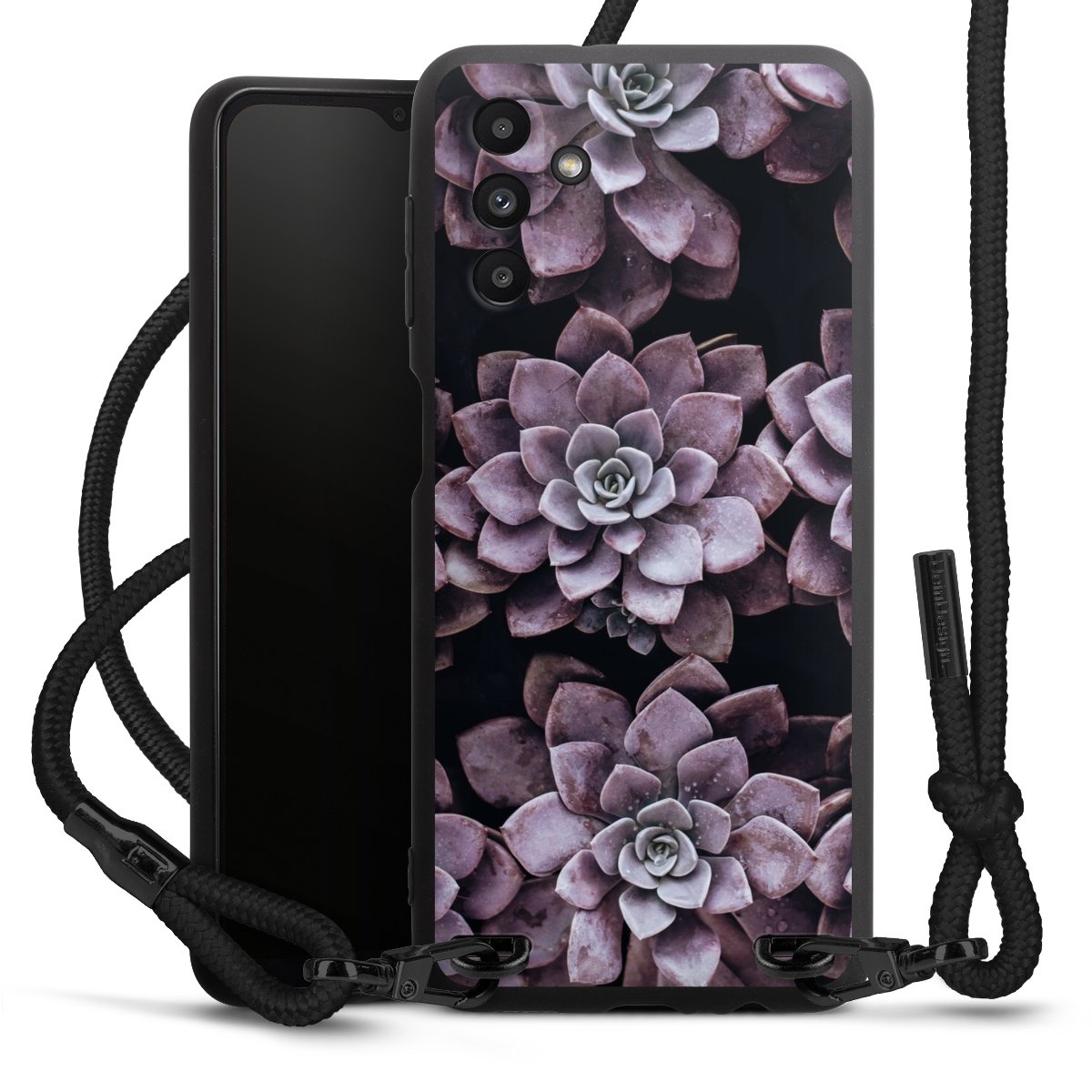 The matt black silicone case is made of flexible TPU (thermoplastic polyurethane) and offers robust protection. The durable, unbreakable material makes the cover flexible and dimensionally stable at the same time. The matte surface makes your design stand out more and is less susceptible to fingerprints and dirt. The stylish trend accessory fits comfortably in the hand and is perfectly complemented by the fabric (polyester) mobile phone strap. The braided fabric strap is approx. 1.70 metres long with a diameter of approx. 0.5 cm. Due to the special knotting technique, the length of the strap can be adjusted by simply pulling it, so that you can adapt it individually to your wishes. The practical case to wear around your neck is available with the fabric strap in black. As a little icing on the cake, we have provided the strap with a chic metal fastener in matt black. The strap is securely fastened to the case with loops made of high-quality genuine leather and press studs. The ends of the fabric strap are covered with metallic end caps and thus protected from fraying.
