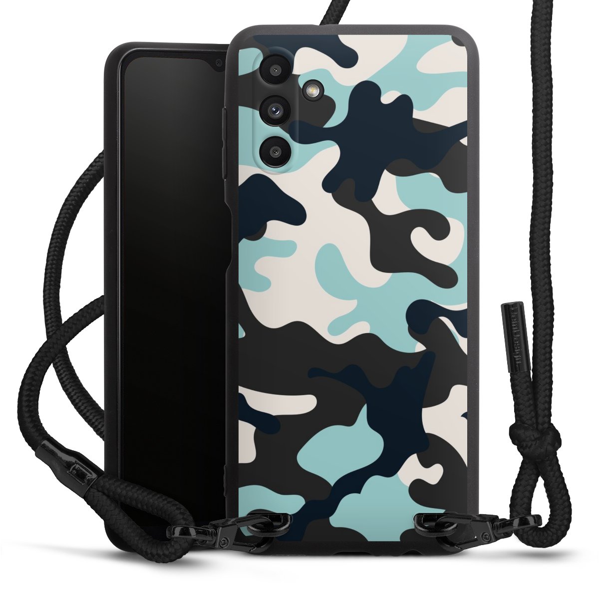 The matt black silicone case is made of flexible TPU (thermoplastic polyurethane) and offers robust protection. The durable, unbreakable material makes the cover flexible and dimensionally stable at the same time. The matte surface makes your design stand out more and is less susceptible to fingerprints and dirt. The stylish trend accessory fits comfortably in the hand and is perfectly complemented by the fabric (polyester) mobile phone strap. The braided fabric strap is approx. 1.70 metres long with a diameter of approx. 0.5 cm. Due to the special knotting technique, the length of the strap can be adjusted by simply pulling it, so that you can adapt it individually to your wishes. The practical case to wear around your neck is available with the fabric strap in black. As a little icing on the cake, we have provided the strap with a chic metal fastener in matt black. The strap is securely fastened to the case with loops made of high-quality genuine leather and press studs. The ends of the fabric strap are covered with metallic end caps and thus protected from fraying.
