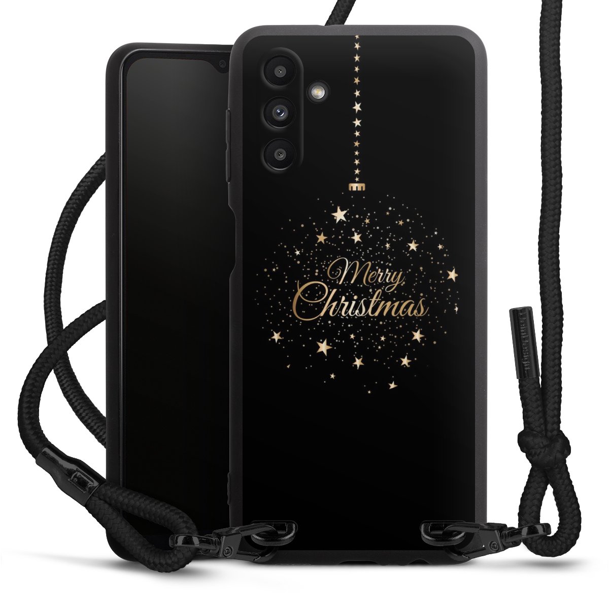 The matt black silicone case is made of flexible TPU (thermoplastic polyurethane) and offers robust protection. The durable, unbreakable material makes the cover flexible and dimensionally stable at the same time. The matte surface makes your design stand out more and is less susceptible to fingerprints and dirt. The stylish trend accessory fits comfortably in the hand and is perfectly complemented by the fabric (polyester) mobile phone strap. The braided fabric strap is approx. 1.70 metres long with a diameter of approx. 0.5 cm. Due to the special knotting technique, the length of the strap can be adjusted by simply pulling it, so that you can adapt it individually to your wishes. The practical case to wear around your neck is available with the fabric strap in black. As a little icing on the cake, we have provided the strap with a chic metal fastener in matt black. The strap is securely fastened to the case with loops made of high-quality genuine leather and press studs. The ends of the fabric strap are covered with metallic end caps and thus protected from fraying.