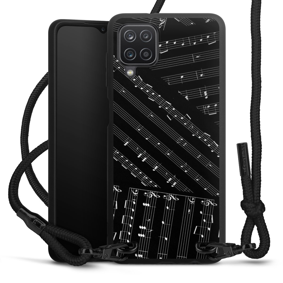 The matt black silicone case is made of flexible TPU (thermoplastic polyurethane) and offers robust protection. The durable, unbreakable material makes the cover flexible and dimensionally stable at the same time. The matte surface makes your design stand out more and is less susceptible to fingerprints and dirt. The stylish trend accessory fits comfortably in the hand and is perfectly complemented by the fabric (polyester) mobile phone strap. The braided fabric strap is approx. 1.70 metres long with a diameter of approx. 0.5 cm. Due to the special knotting technique, the length of the strap can be adjusted by simply pulling it, so that you can adapt it individually to your wishes. The practical case to wear around your neck is available with the fabric strap in black. As a little icing on the cake, we have provided the strap with a chic metal fastener in matt black. The strap is securely fastened to the case with loops made of high-quality genuine leather and press studs. The ends of the fabric strap are covered with metallic end caps and thus protected from fraying.