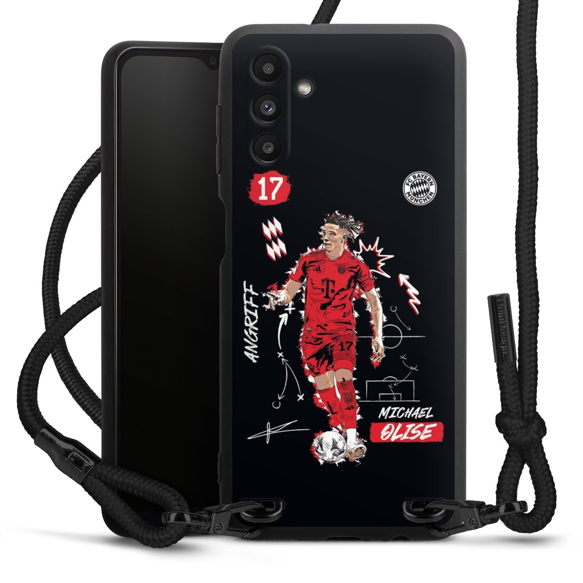 The matt black silicone case is made of flexible TPU (thermoplastic polyurethane) and offers robust protection. The durable, unbreakable material makes the cover flexible and dimensionally stable at the same time. The matte surface makes your design stand out more and is less susceptible to fingerprints and dirt. The stylish trend accessory fits comfortably in the hand and is perfectly complemented by the fabric (polyester) mobile phone strap. The braided fabric strap is approx. 1.70 metres long with a diameter of approx. 0.5 cm. Due to the special knotting technique, the length of the strap can be adjusted by simply pulling it, so that you can adapt it individually to your wishes. The practical case to wear around your neck is available with the fabric strap in black. As a little icing on the cake, we have provided the strap with a chic metal fastener in matt black. The strap is securely fastened to the case with loops made of high-quality genuine leather and press studs. The ends of the fabric strap are covered with metallic end caps and thus protected from fraying.