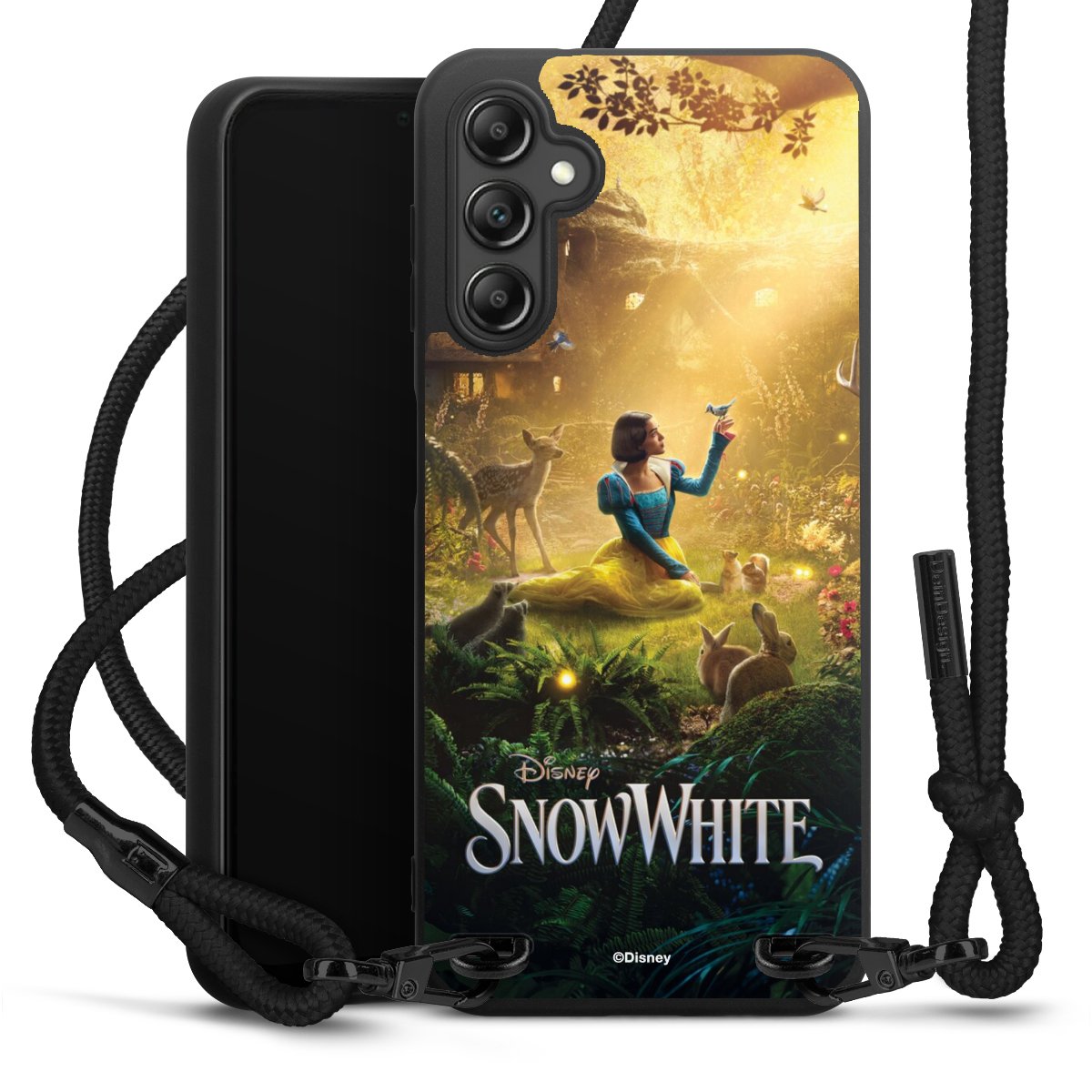 The matt black silicone case is made of flexible TPU (thermoplastic polyurethane) and offers robust protection. The durable, unbreakable material makes the cover flexible and dimensionally stable at the same time. The matte surface makes your design stand out more and is less susceptible to fingerprints and dirt. The stylish trend accessory fits comfortably in the hand and is perfectly complemented by the fabric (polyester) mobile phone strap. The braided fabric strap is approx. 1.70 metres long with a diameter of approx. 0.5 cm. Due to the special knotting technique, the length of the strap can be adjusted by simply pulling it, so that you can adapt it individually to your wishes. The practical case to wear around your neck is available with the fabric strap in black. As a little icing on the cake, we have provided the strap with a chic metal fastener in matt black. The strap is securely fastened to the case with loops made of high-quality genuine leather and press studs. The ends of the fabric strap are covered with metallic end caps and thus protected from fraying.
