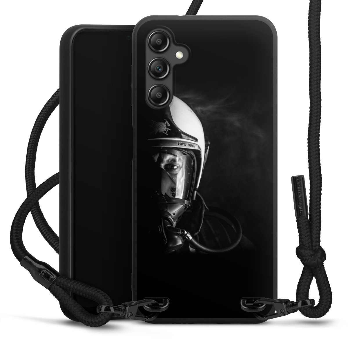 The matt black silicone case is made of flexible TPU (thermoplastic polyurethane) and offers robust protection. The durable, unbreakable material makes the cover flexible and dimensionally stable at the same time. The matte surface makes your design stand out more and is less susceptible to fingerprints and dirt. The stylish trend accessory fits comfortably in the hand and is perfectly complemented by the fabric (polyester) mobile phone strap. The braided fabric strap is approx. 1.70 metres long with a diameter of approx. 0.5 cm. Due to the special knotting technique, the length of the strap can be adjusted by simply pulling it, so that you can adapt it individually to your wishes. The practical case to wear around your neck is available with the fabric strap in black. As a little icing on the cake, we have provided the strap with a chic metal fastener in matt black. The strap is securely fastened to the case with loops made of high-quality genuine leather and press studs. The ends of the fabric strap are covered with metallic end caps and thus protected from fraying.